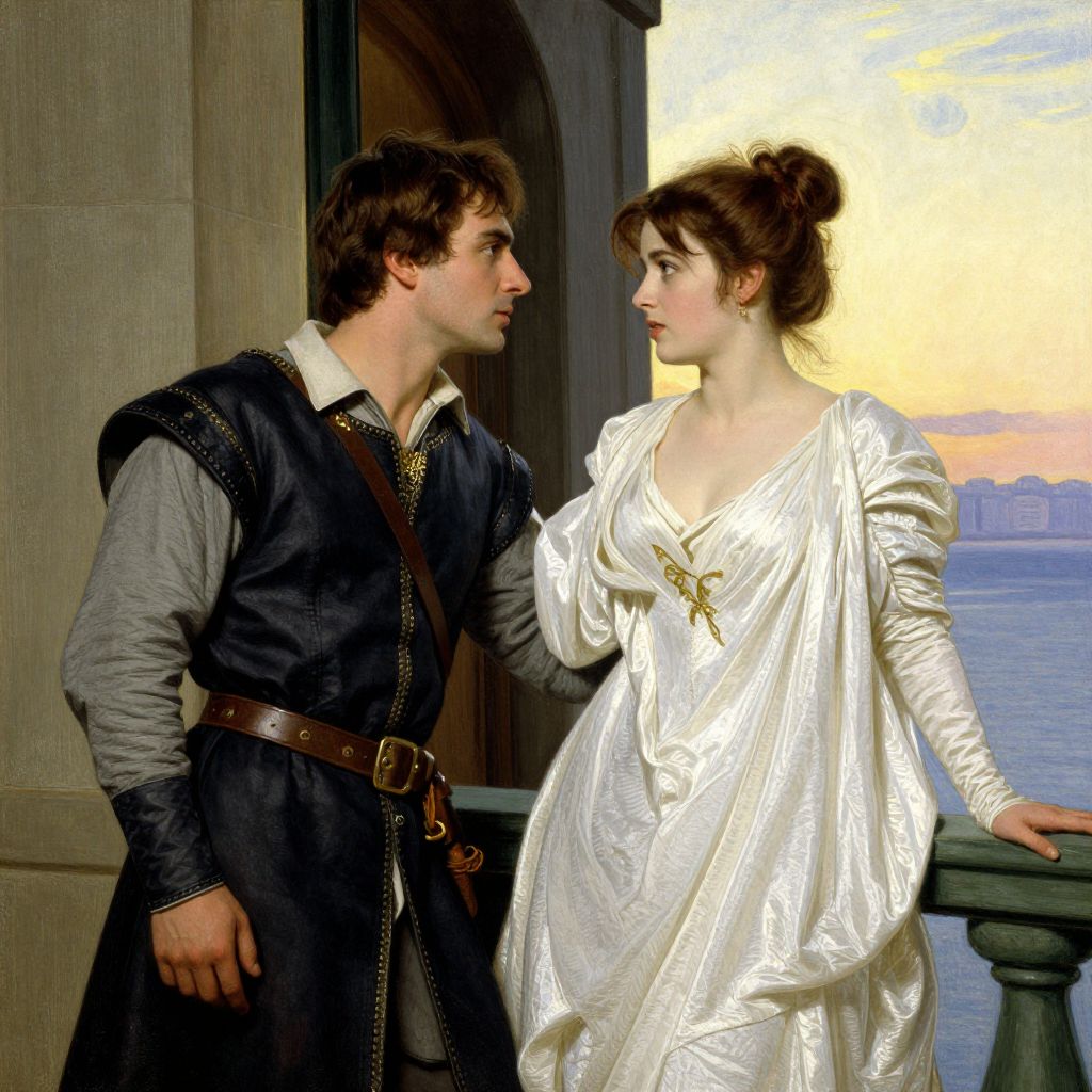 A man in medieval attire gazes longingly at a woman in a white dress on a balcony, reminiscent of the balcony scene from Romeo and Juliet, painted in the style of Waterhouse.