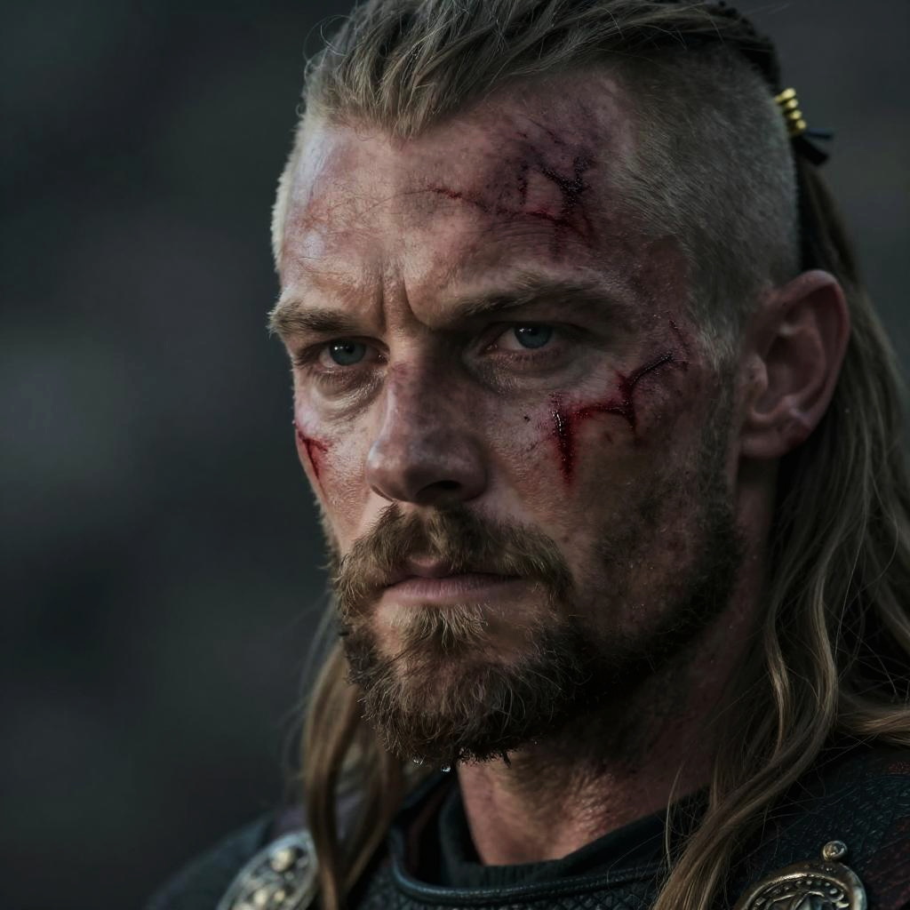 Cinematic close-up portrait of a Viking warrior man with blood and warrior face paint on his weathered face. The man has long blonde hair styled back with some shaved sides, a full beard, and piercing blue eyes. He wears traditional Viking leather armor with metallic details. The image features shallow depth of field and moody lighting, emphasizing the warrior's intense expression and detailed facial wounds.