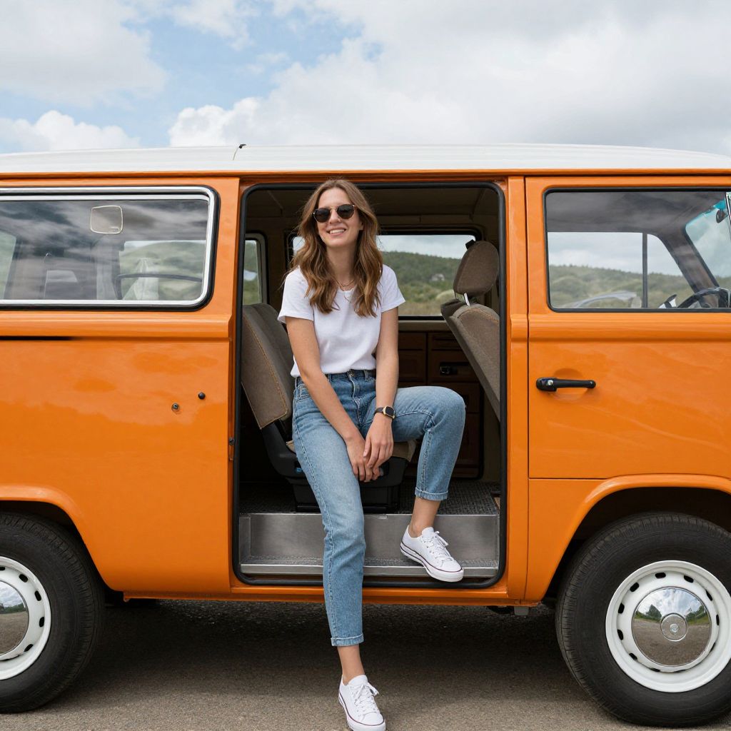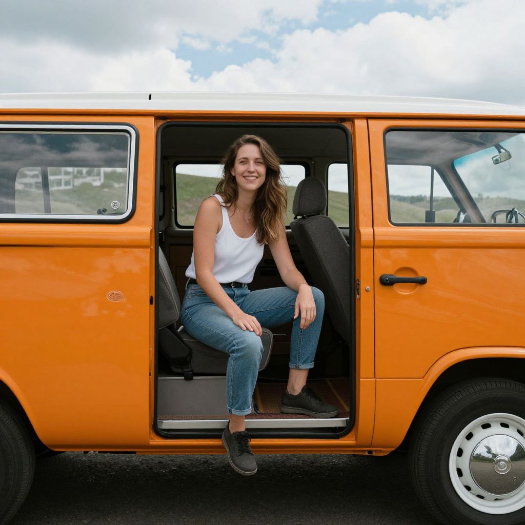 Smiling woman perched casually on the open door of a vibrant orange vintage van, ready for a carefree road trip under a partly cloudy sky.