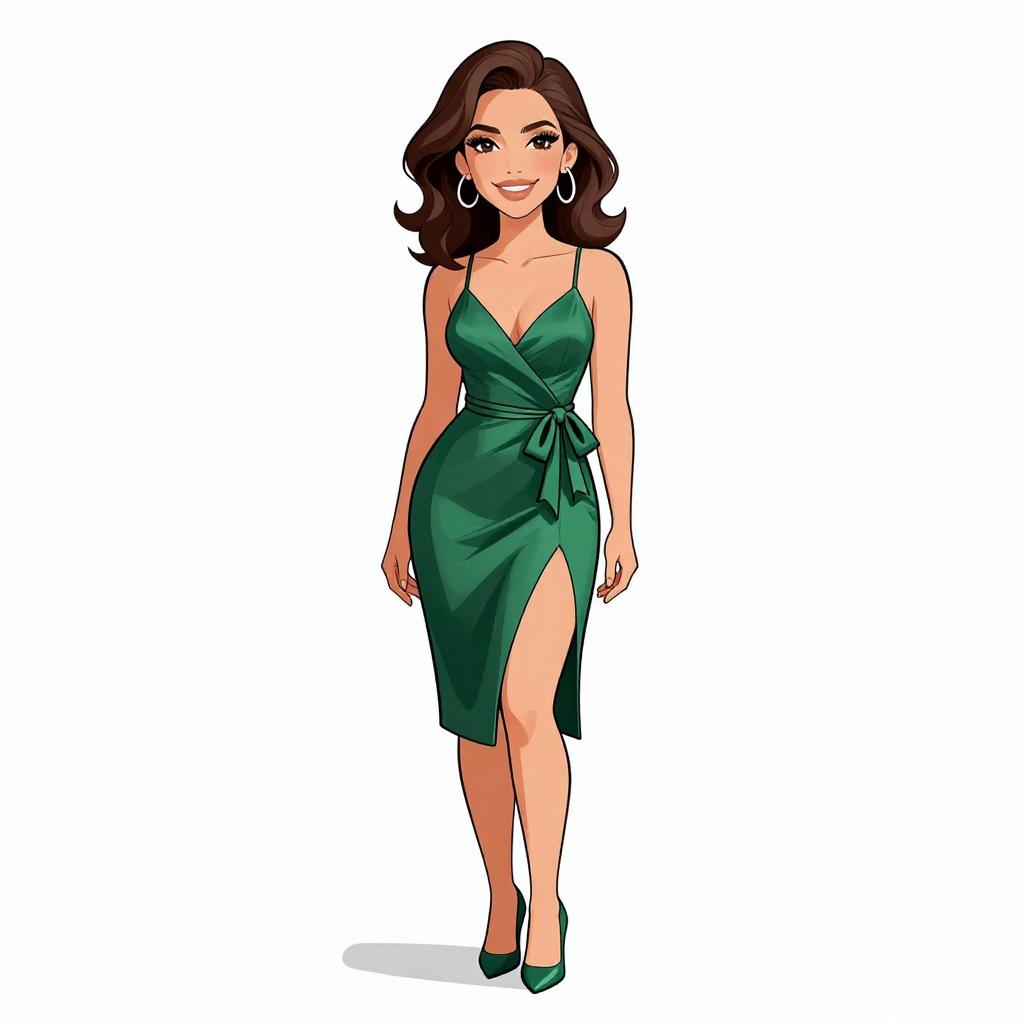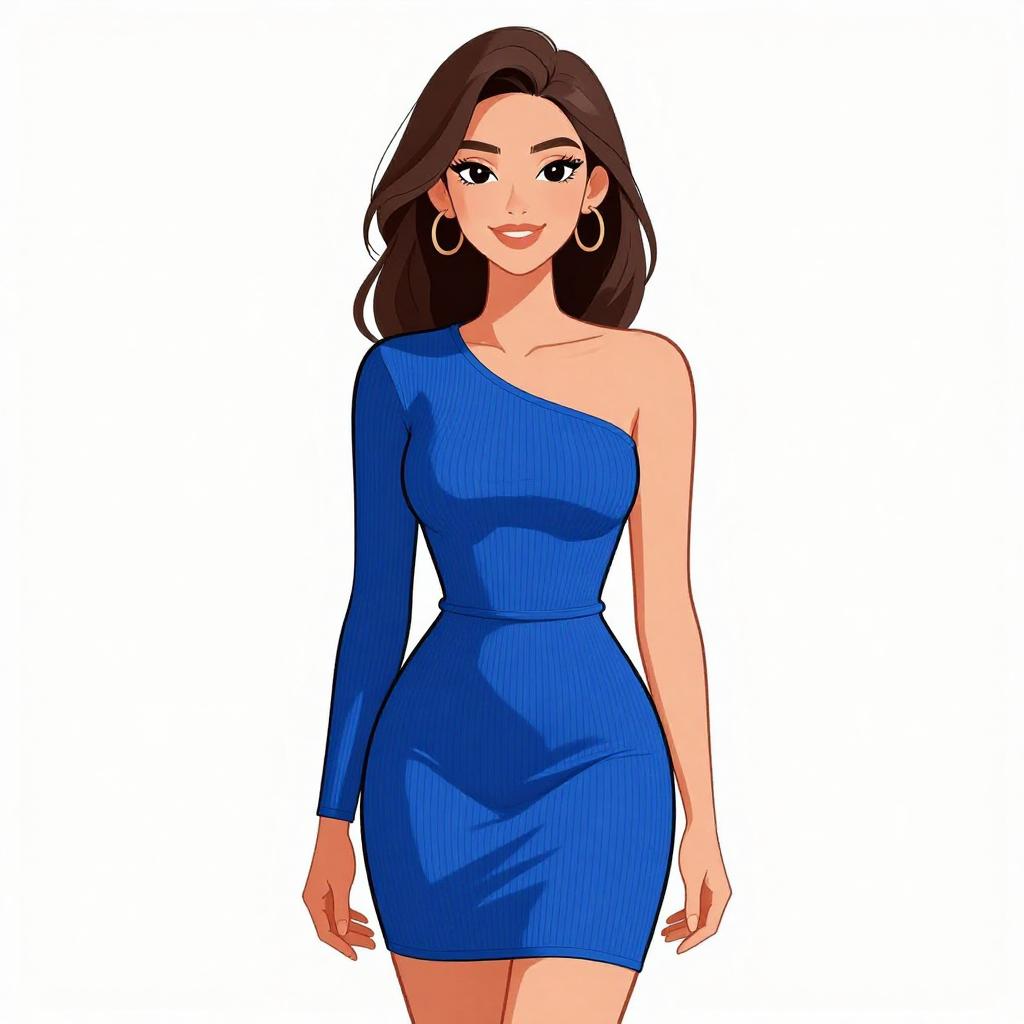 Woman with pretty face and pretty hair. smiling Woman, contemporary chic, sky blue bodycon mini dress, high neck, long sleeves with adjustable side drawstrings for ruching effect, fitting silhouette, nude strappy heels, minimalistic style, white studio background. --sref 1467