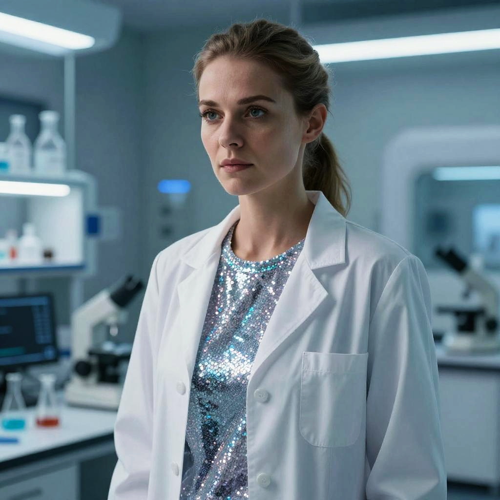 Photograph of a young Caucasian woman with fair skin and brown hair in a ponytail, standing in a modern, brightly lit laboratory. She wears a white lab coat over a shimmering silver sequin top and has a serious expression. The background includes laboratory equipment, shelves with bottles, and a microscope. The lighting is cool and clinical, emphasizing the sterile environment. Her blue eyes are focused forward, and the lab coat has a single buttoned pocket. The image has a slightly cinematic quality, suggesting a dramatic or scientific context.