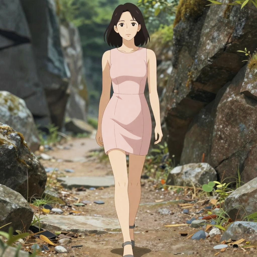 An anime-style illustration of a woman with short dark hair wearing a minimalist chic sleeveless pale pink mini dress with a structured bodice. She is walking confidently along a rocky hiking trail surrounded by large stones and greenery, depicted in the detailed and vibrant style of Kyoto Animation. She completes her outfit with gray ankle strap heels. The background features a natural canyon landscape with blurred trees and rock formations.