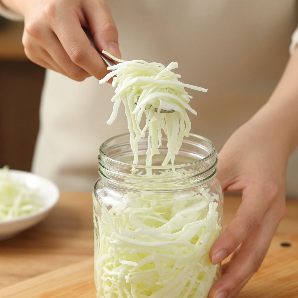 Woman scooping shredded cabbage out of a jar.