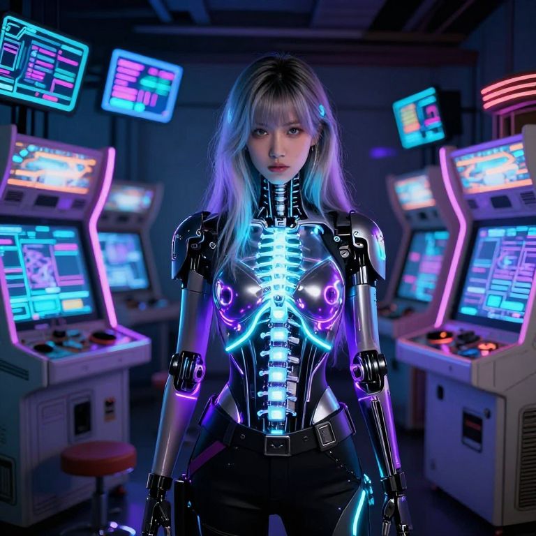 A cyberpunk girl with long, silver-streaked hair and a glowing silver cybernetic spine, standing in the center of an abandoned high-tech arcade, surrounded by shattered holograms and flickering LED panels, her LED-embedded outfit pulsing with violet and cyan light as she looks directly into the camera.