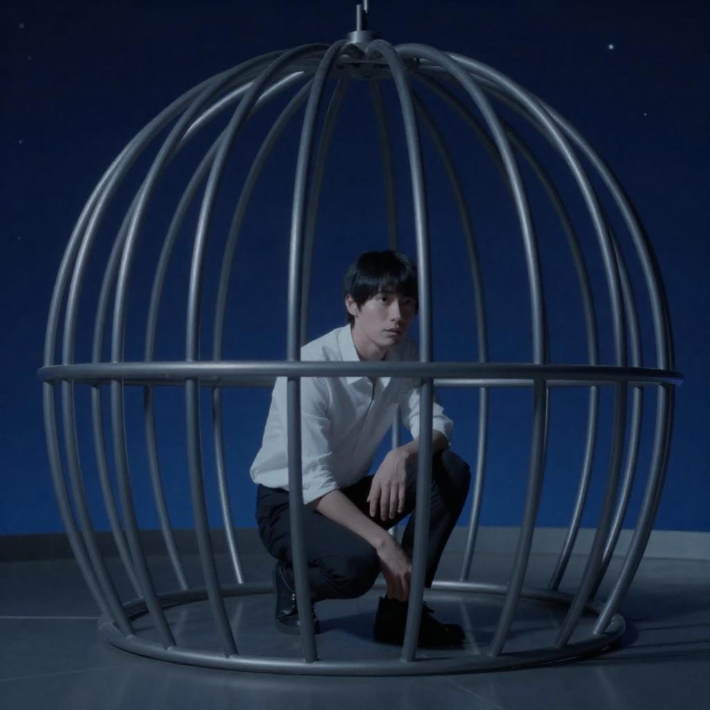 Photograph of a person in a blue-lit, circular, metal cage with radiating spokes, resembling a spaceship or futuristic structure. The person, wearing a white shirt and dark pants, is crouched inside, looking towards the camera. The background is a starry blue night sky. The image has a sci-fi, exploratory theme.