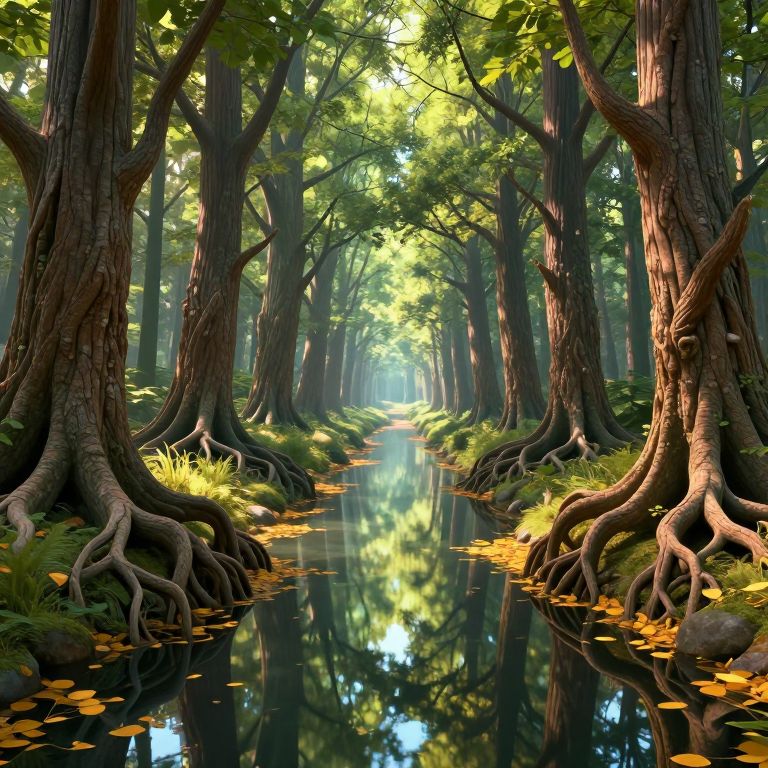 Photorealistic digital artwork of a serene forest scene. Tall, thick-trunked trees with gnarled roots surround a narrow, reflective creek, creating a mirror-like effect. Bright green leaves filter sunlight, casting dappled shadows on the water. Yellow leaves float on the creek's surface. The forest floor is covered in moss and small plants. The background fades into a misty, sunlit distance, enhancing the tranquil, immersive atmosphere. The rich textures of tree bark and roots contrast with the smooth, reflective water, creating a balanced, harmonious composition.