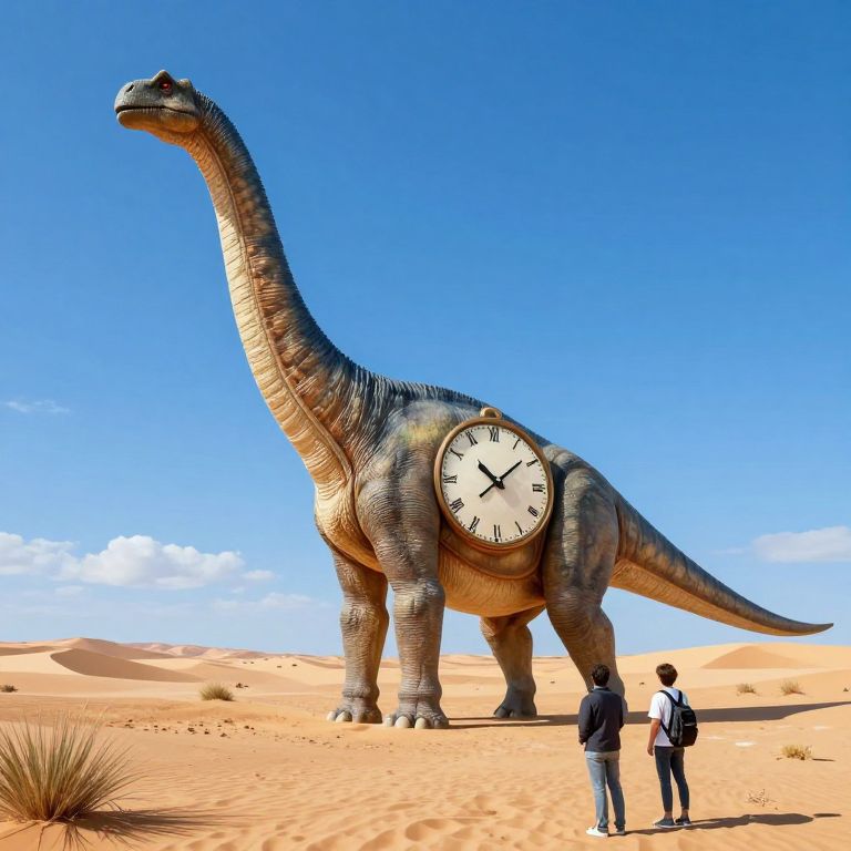 In a surreal 3D-rendered desert landscape under a vibrant blue sky, a giant sauropod dinosaur stands as a whimsical clock tower, its belly adorned with a large, ticking clock face, capturing the imagination of two visitors who gaze in awe at this impossible regression of time and prehistoric fantasy.