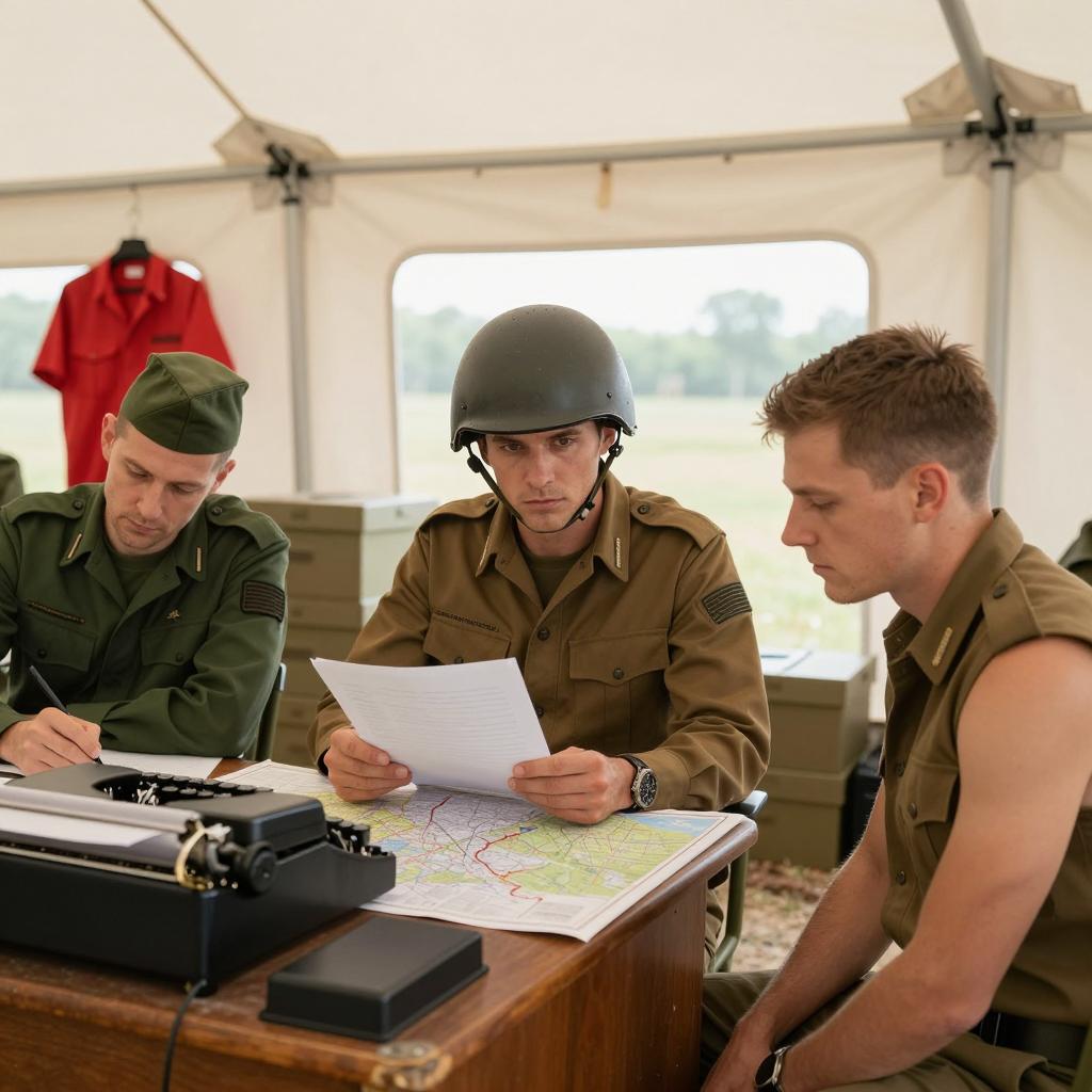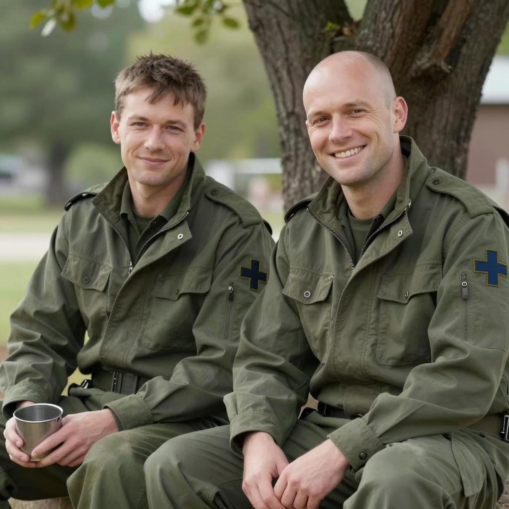 Two men sitting outdoors beside a tree. Both wear green military-style jackets; the man on the left has brown hair and a slight smile, holding a metal cup. The man on the right is bald, smiling broadly, and has a patch with a blue cross on his jacket. Background includes blurred greenery and trees.