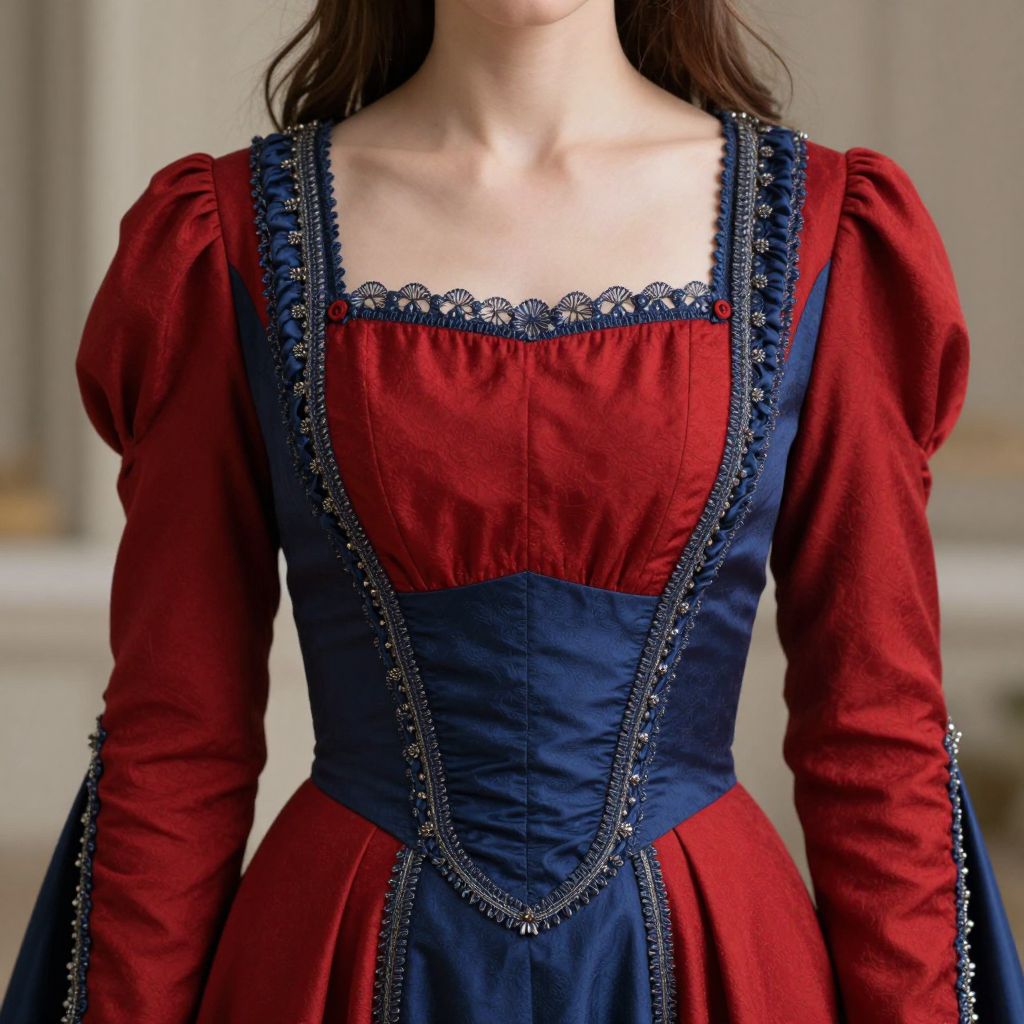 Lord farquaad dress, a close up of a woman in a red and blue dress