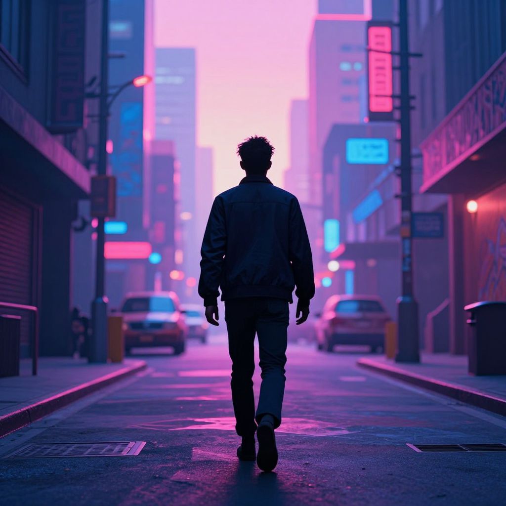 In this captivating digital artwork, a solitary figure strides confidently down a neon-lit urban alleyway, their silhouette illuminated by vibrant hues of pink, blue, and purple. The man, dressed in a dark, form-fitting jacket and pants, appears to be on a journey, moving towards the horizon where the colors blend into a soft, ethereal glow. The cityscape, a blend of modern architecture and street art, frames the scene, with buildings towering in the background and a few scattered vehicles adding to the urban atmosphere. The interplay of light and shadow creates a sense of depth and movement, while the lo-fi aesthetic of the image evokes a sense of nostalgia and mystery. The overall composition is dynamic, with the figure positioned centrally, drawing the viewer's eye through the scene and inviting them to explore the narrative unfolding before them.