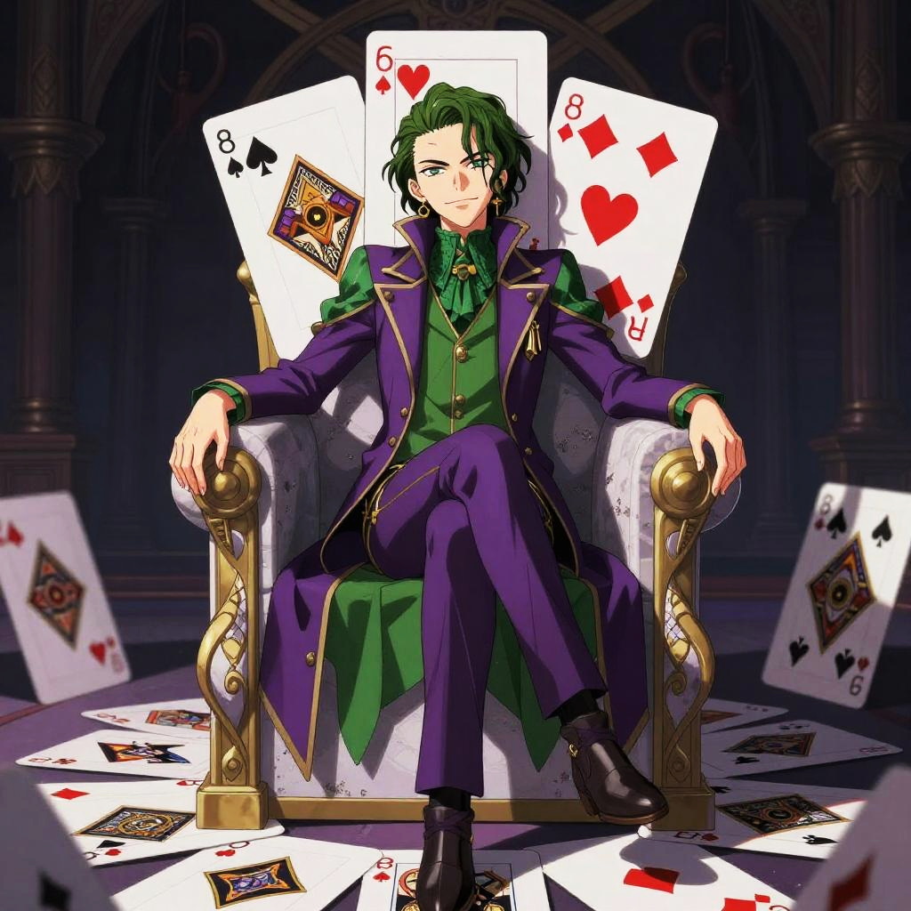 Joker anime girl sitting on a throne made of playing cards, confident and mysterious expression, elaborate costume with purple and green hues, gothic anime style, intricate background full of shadows