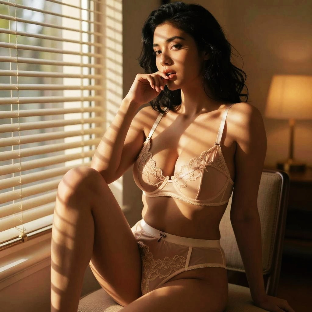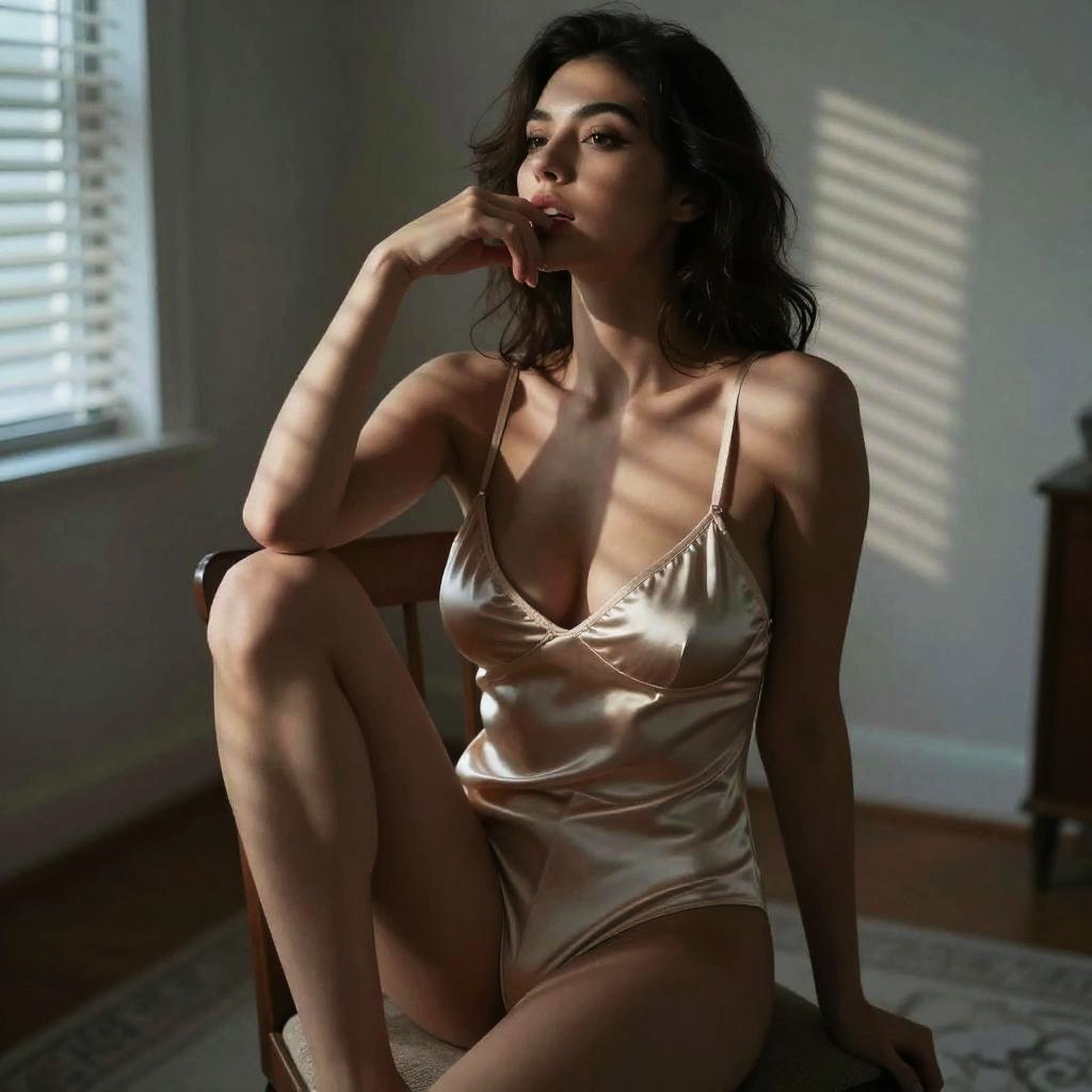 Fine-art boudoir lifestyle photo, woman with big brasts seated on a chair near a window, one knee raised and the other leg relaxed, fingers lightly touching her lips, dramatic patterned shadows from blinds across her face and shoulders, tasteful lingerie-inspired outfit (no explicit nudity), shallow depth of field, brunette with sleek straight hair and soft smoky eyes, wearing a sheer robe layered over a satin slip in emerald, sunlit room with a pale rug and warm wood tones, backlit glow from the window with delicate haze, high resolution