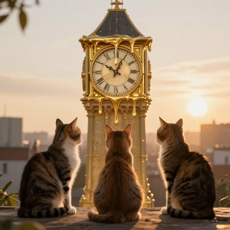 Amidst the golden glow of a surreal clock tower that weeps time like molten wax, three cats sit in quiet contemplation, their whispers echoing the timeless mystery of existence as the air hums with the warmth of an eternal afternoon.