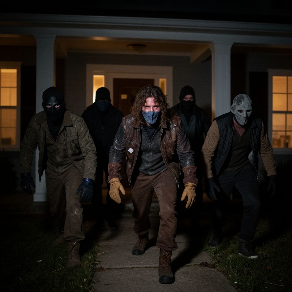 Photograph of five masked individuals in dark, rugged clothing and gloves, walking towards the camera in front of a dimly lit, suburban house with illuminated windows. The central figure has long, messy hair, a red glowing face mask, and brown gloves. The background is shadowy, with the house's white columns and porch partially visible. The scene is tense, with the figures appearing to be in a covert operation, and the lighting emphasizes their intimidating presence. The image has a dramatic, nighttime atmosphere.