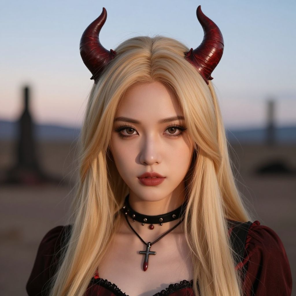 Photograph of an East Asian woman with long black hair, wearing red devil horns and a black top, against a dark gray background, with a neutral