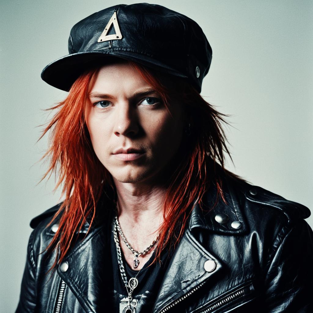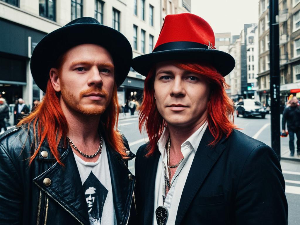 Slash And Axl Rose Fancy Dress face swap, man with red hair and a hat on a city street