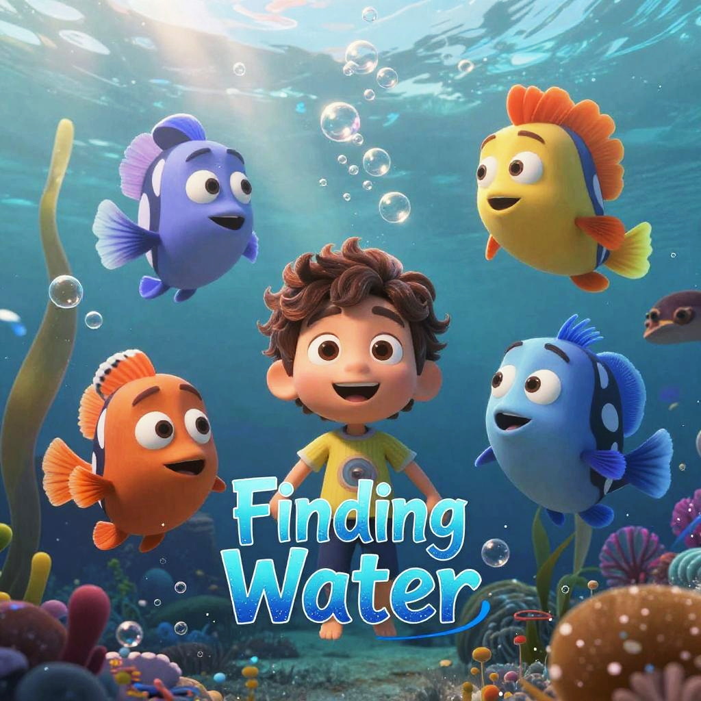 Pixar-style underwater adventure titled 'Finding Water', colorful marine life with expressive characters, dramatic ocean lighting, detailed bubbles and flowing seaweed, soft shading and vibrant hues, warm and inviting atmosphere, storytelling through visual depth and emotion