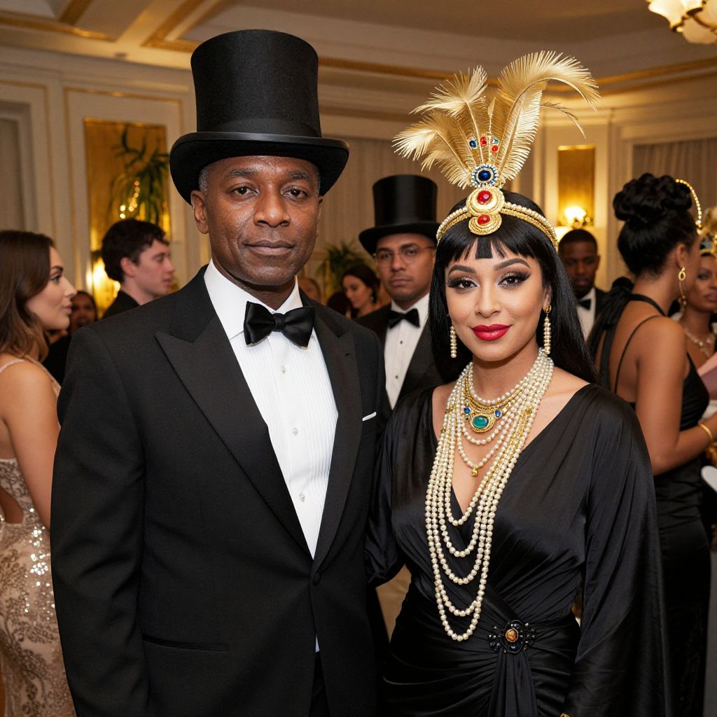 Elegantly dressed guests attend a lavish King Tut-themed New Year's celebration, with one man in a black top hat and tuxedo standing beside a woman adorned in a gold headpiece and layered pearl necklaces.