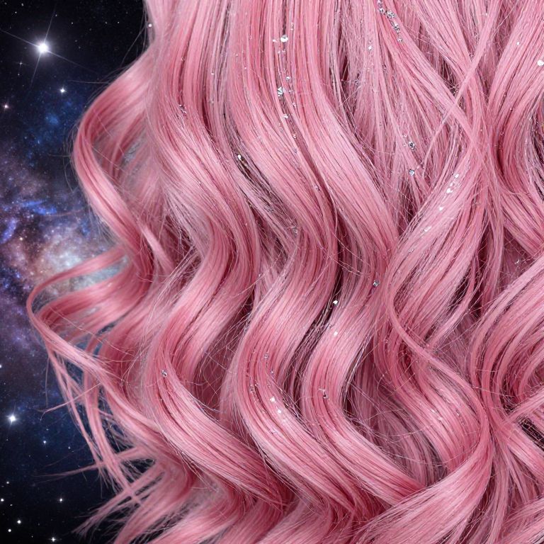 Close-up of wavy pink hair intertwined with silver glitter, set against a cosmic galaxy background, stars twinkling with an otherworldly glow, high detail