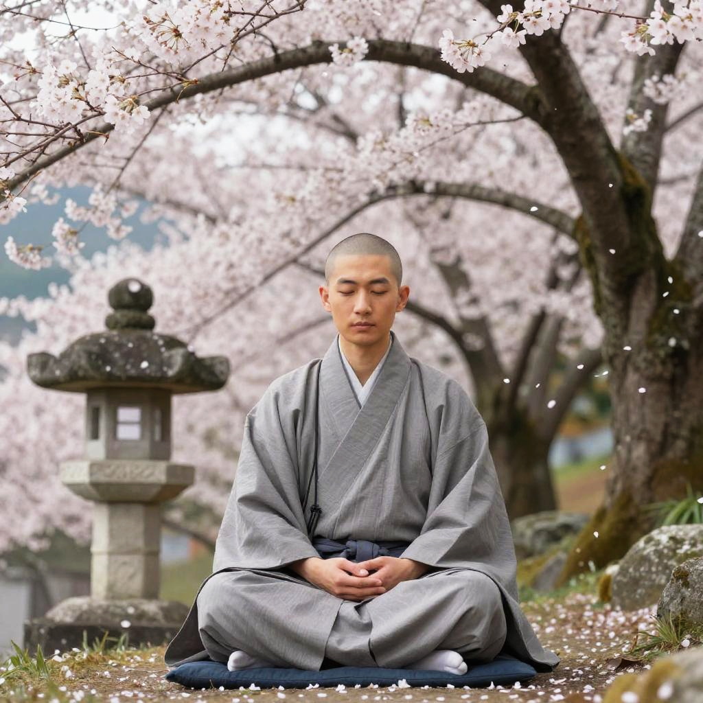 Takehiko, a calm mountain monk meditating under cherry blossom trees in full bloom, traditional robes and a stone lantern nearby, soft pastel colors with a gentle breeze moving petals, a tranquil and spiritual mood