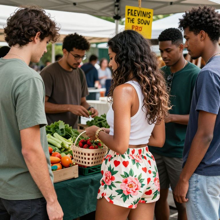 Busty short women at a bustling market, vibrant street fashion, diverse crowd, colorful stalls with fruits and flowers, lively ambiance, warm sunlight, high detail and vivid colors