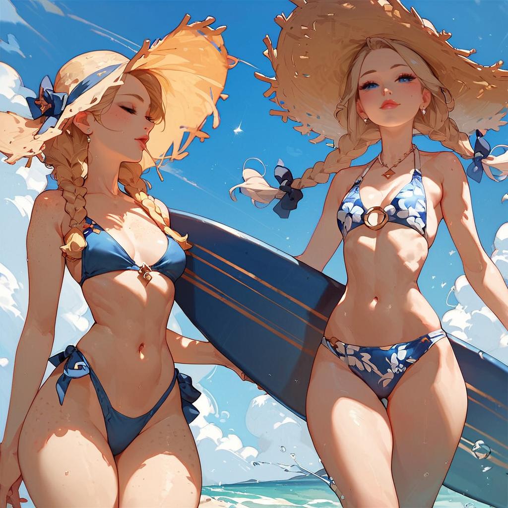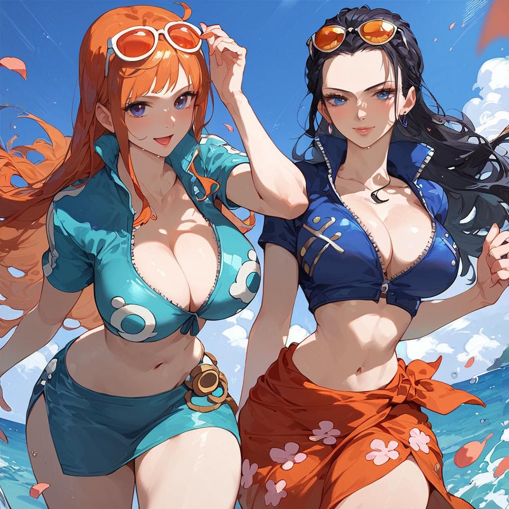 Digital anime-style illustration featuring two confident women standing on a ship deck with the sea and sky in the background. One has long orange hair, blue eyes, and wears a turquoise cropped jacket and skirt with circular patterns. The other has long black hair slicked back, blue eyes, and wears a partially unzipped navy blue cropped jacket with a red floral sarong. Both have sunglasses on their heads, and cherry blossom petals float around them.