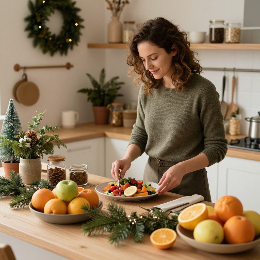 Woman preparing festive dishes in a cozy kitchen, surrounded by fresh fruits, greenery, and holiday-themed decor, creating a warm and inviting atmosphere for a Christmas market-inspired gathering.