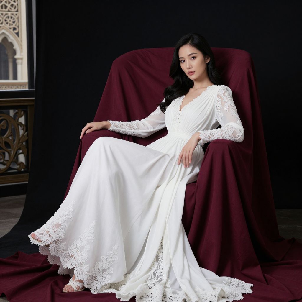 Elegant portrait of a woman in a flowing white gown adorned with lace detailing, seated gracefully on a plush armchair draped in rich maroon fabric, set against a dark backdrop with a glimpse of an ornate architectural structure visible through an open window.
