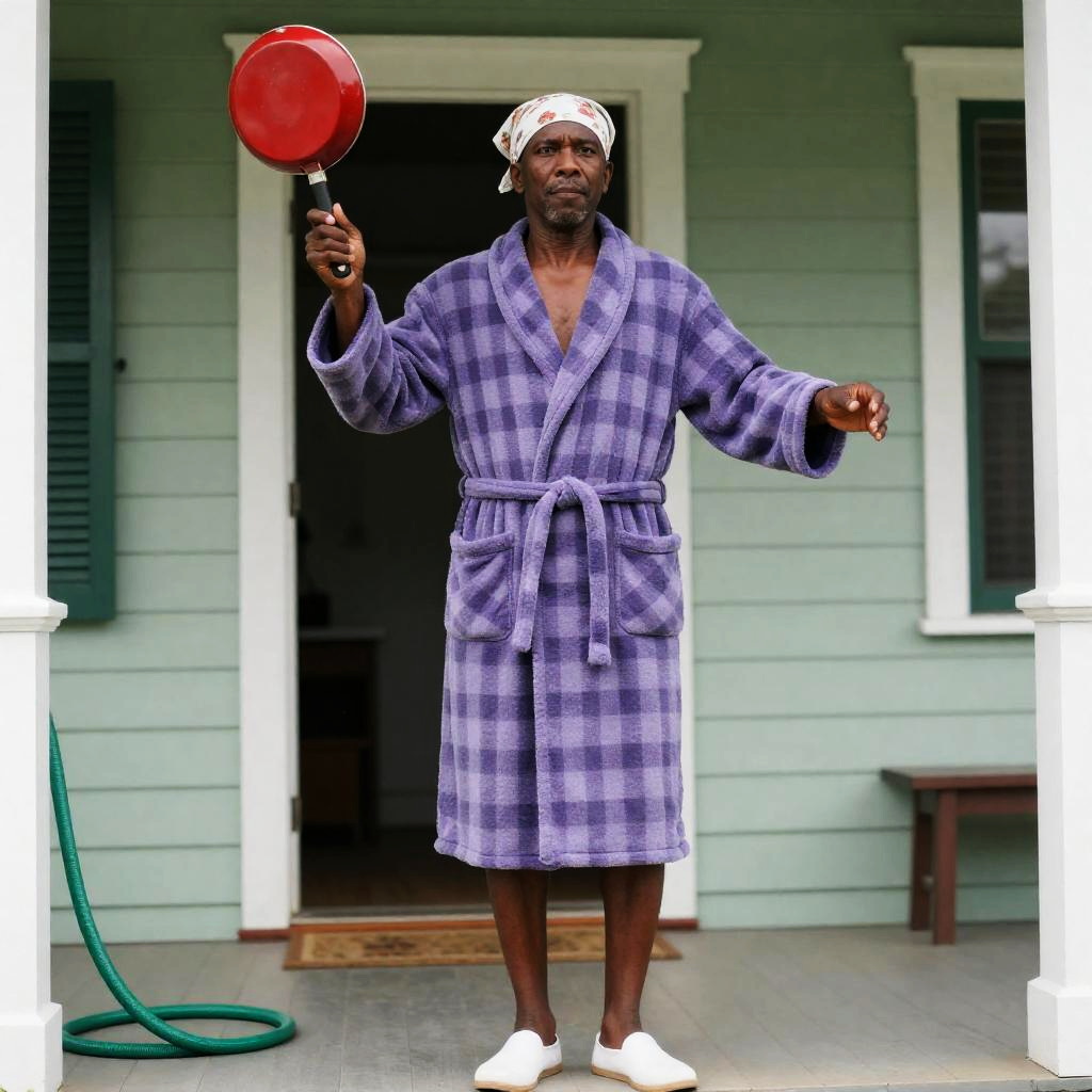 A middle-aged Black man in a purple plaid bathrobe and floral headscarf stands on a porch, balancing a red frying pan on his right hand, with his left arm extended. He wears white shoes. The background shows a green house with an open door. A green garden hose lies on the porch floor. His expression is focused.