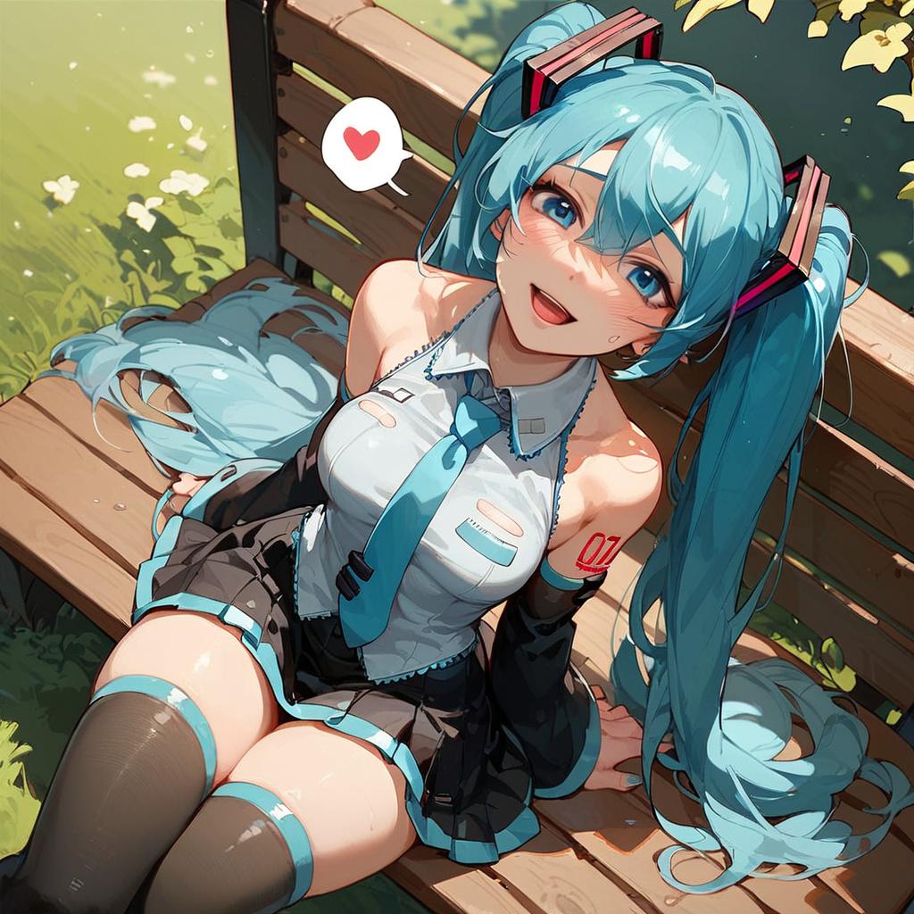 Score_9, score_8_up, score_7_up, score_6_up, score_5_up, score_4_up, questionable, a girl sitting on a park bench, hatsune miku, detached sleeves, thighhighs