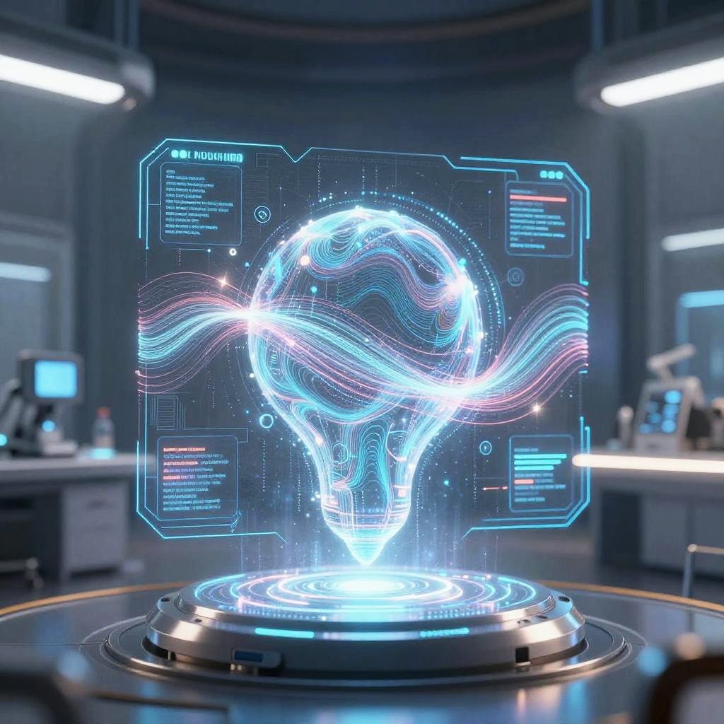 Midjourney diffusion model depicted as a glowing holographic interface in a sci-fi lab, intricate data flows and wave patterns radiating outward, sleek metallic environment, ultra-realistic