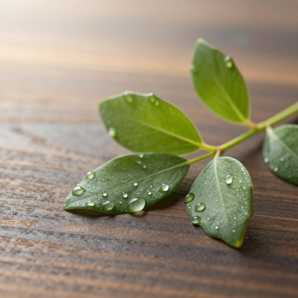 Macro close-up of dewy fresh green leaves and tiny droplets on dark smooth wooden table under warm golden hour light, 8K resolution, minimalistic, bright, authentic, healthy, vibrant, photorealistic.