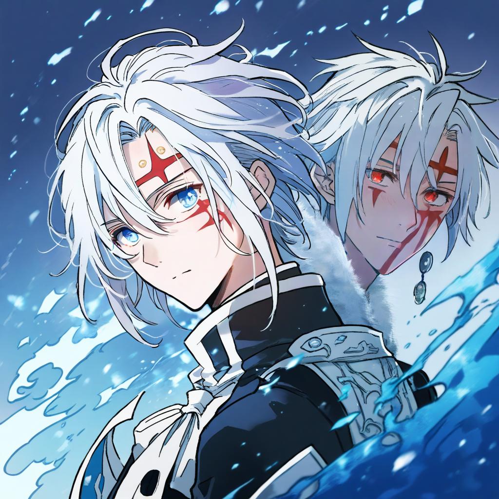 Digital illustration of two anime-style male characters with white hair and distinctive red facial marks. One character has striking blue eyes, short messy hair, and wears a dark uniform with white details and a high collar. The other character has red eyes, similar white hair, and wears a fur-lined outfit with decorative earrings. The background features dynamic blue water and a snowy atmosphere, highlighting a cold, intense setting.