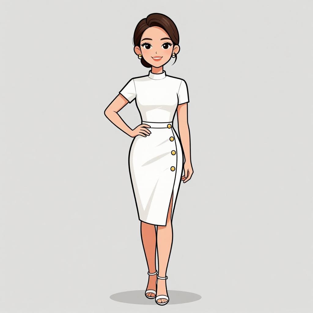 Woman with pretty face and pretty hair. smiling Woman, chic, tailored white blazer dress, deep V neckline, long sleeves, structured shoulders, mid-thigh length, gold zipper detail diagonally across front. --sref 1467