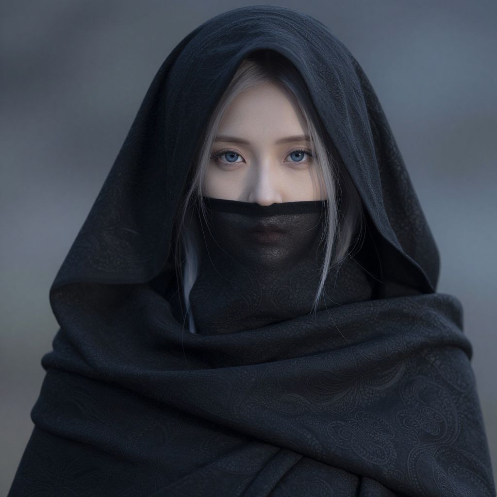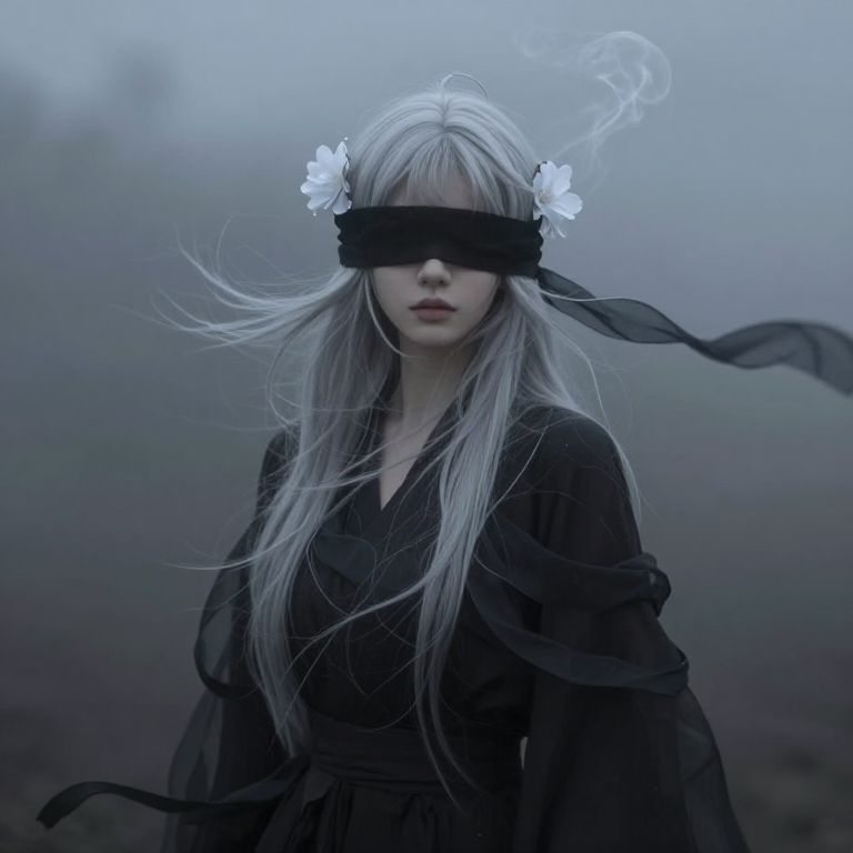 A mysterious figure stands shrouded in mist, her silver-white hair billowing like wisps of smoke in the wind, Her eyes are concealed by a delicate black blindfold, adding to her ethereal, enigmatic presence, Pale flowers adorn her hair, [softly glowing], contrasting against the dark, flowing ribbons that wrap around her form, The [background fades into a blur of swirling shadows], creating a sense of motion and isolation, as if she is caught between realms, The overall atmosphere is one of melancholy beauty, with subtle hints of forgotten power and silent sorrow