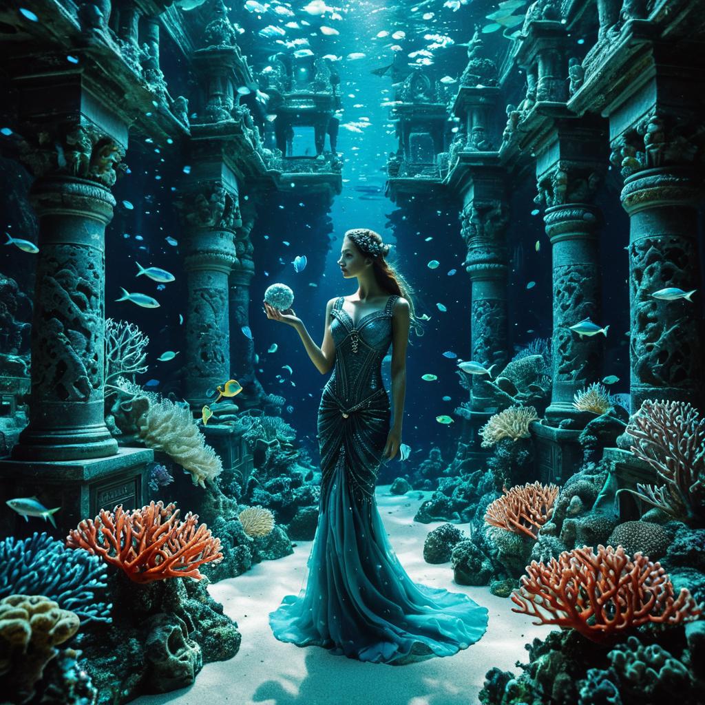 A graceful swan holding a silver feather inside a tranquil lake, surrounded by shimmering water lilies, dragonflies, and soft ripples.