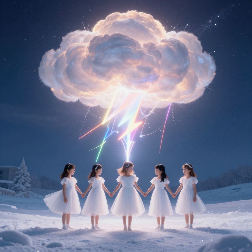 Five children in ethereal white dresses stand hand-in-hand on a snowy landscape, their forms illuminated by vibrant, rainbow-colored lightning bolts emanating from a massive, luminous cloud above them, creating a surreal and dreamlike digital artwork with a fantastical, otherworldly aesthetic.