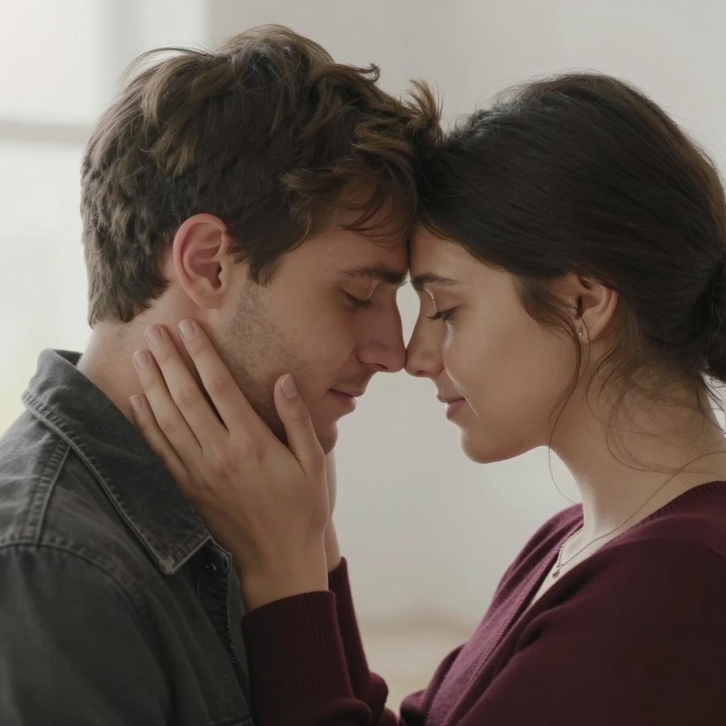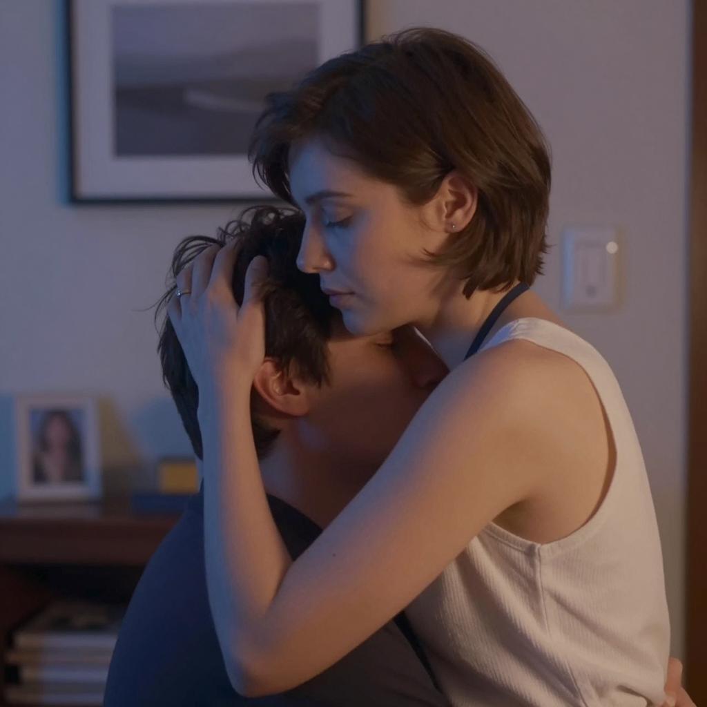 Two women kissing in a dimly lit room. The woman on the left has brown hair in a ponytail, wearing a gray sleeveless top with red trim. The woman on the right has wet, wavy brown hair, wearing a dark green sweater. The woman on the right holds the other's face gently. Background includes a window with blinds and a bag on the right.
