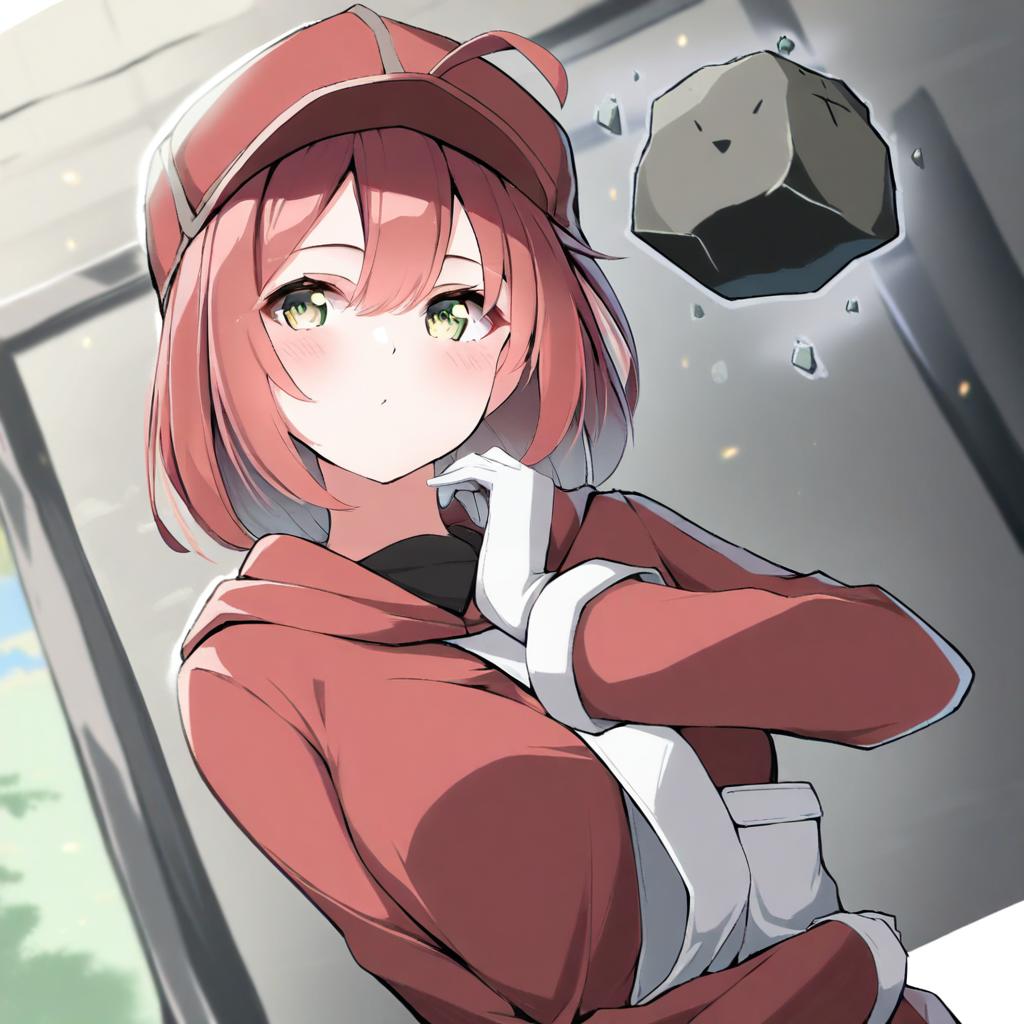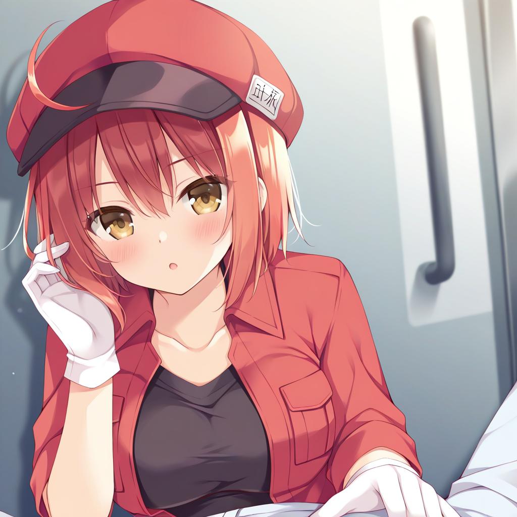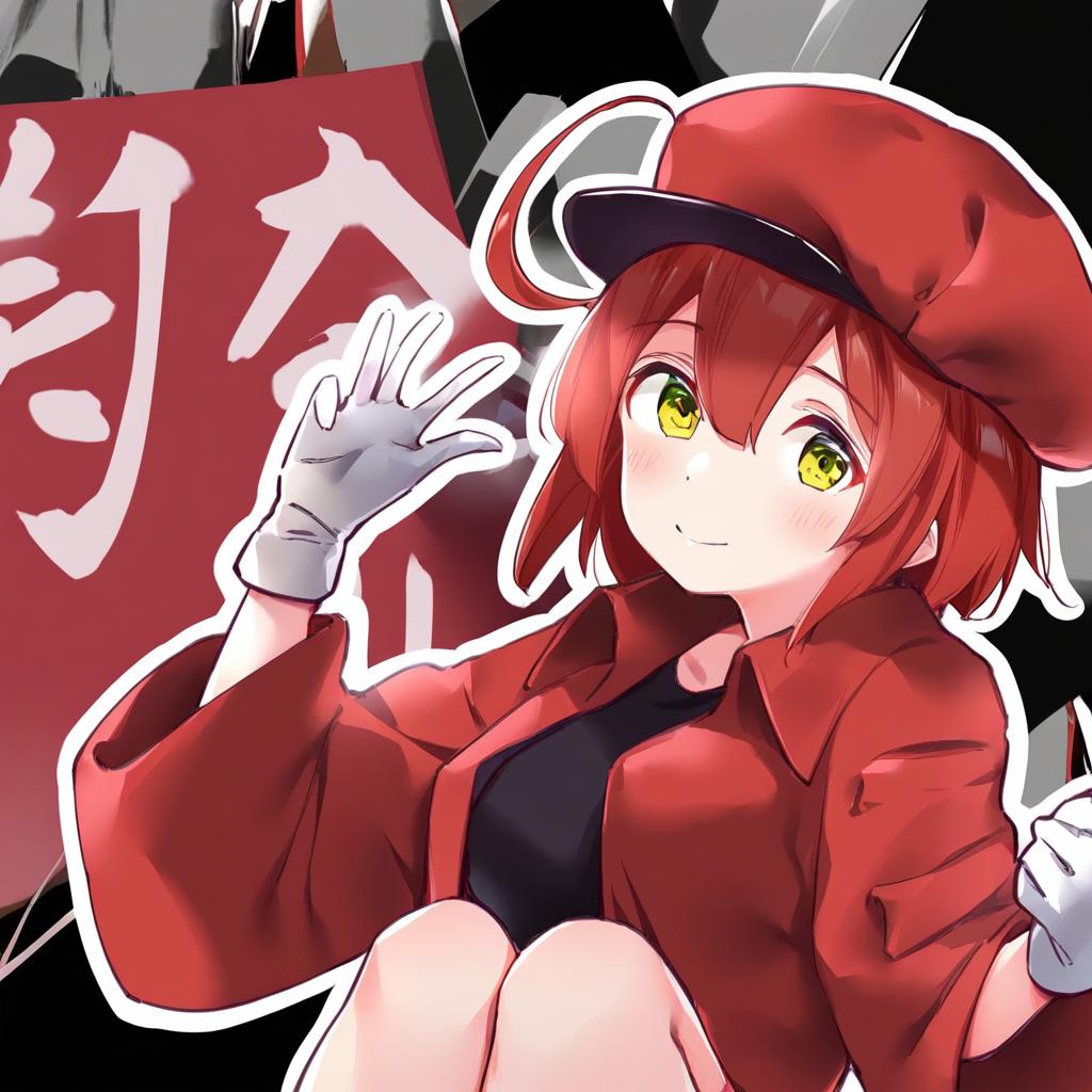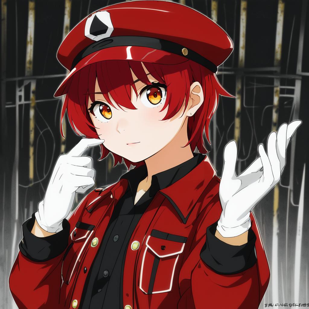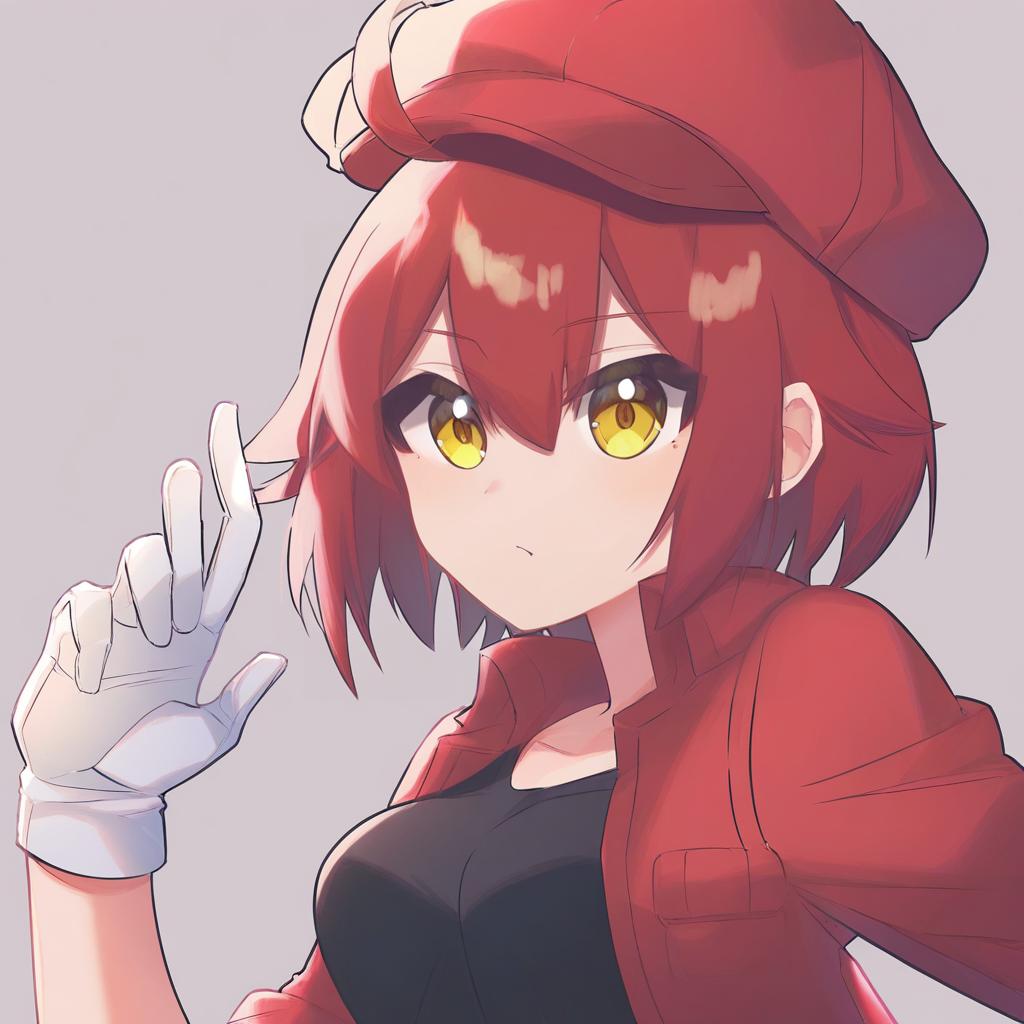 Ae-3803, hataraku saibou, 1girl, yellow eyes, hair between eyes, red hair, short hair, ahoge, medium breasts, cabbie hat, red jacket, white gloves, black shirt, red headwear, by artist yuyaiyaui, leet