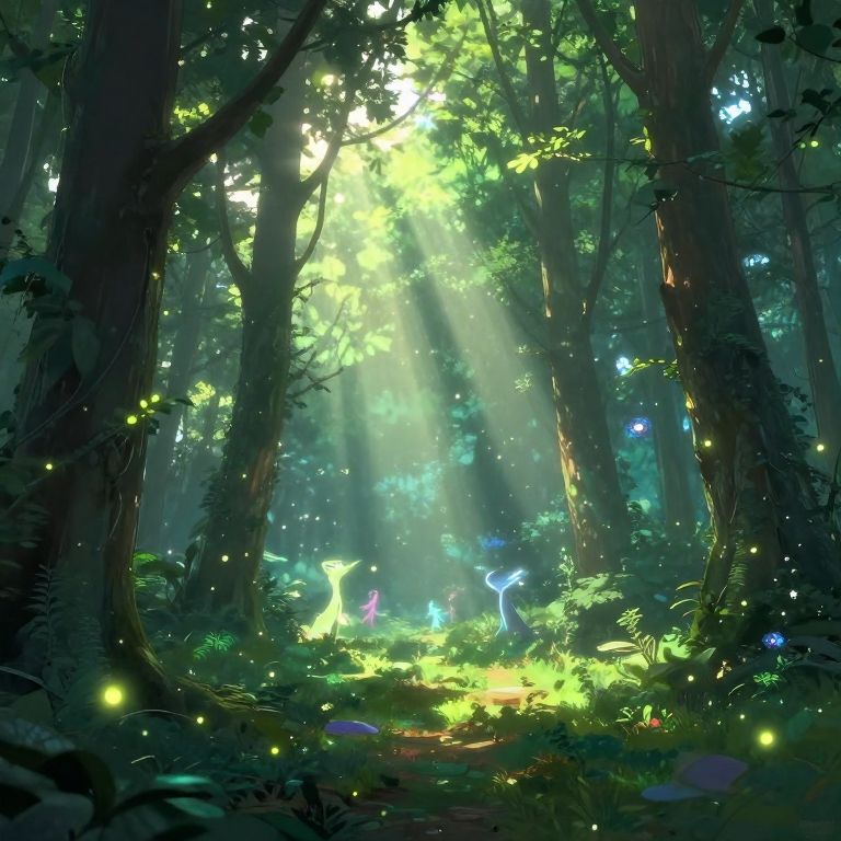 Sparking magical forest clearing at dawn, ethereal light beams piercing through ancient trees, sparkling particles floating in the air like fireflies, mystical creatures in the background, vivid greens and soft glowing effects, fantasy art style.