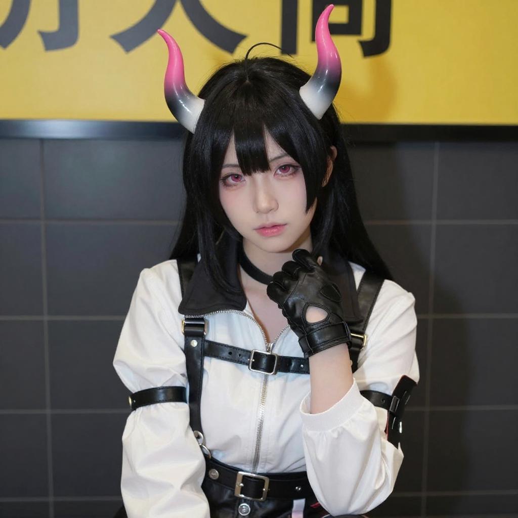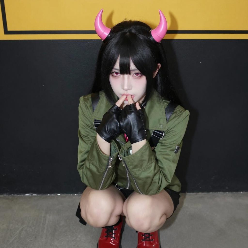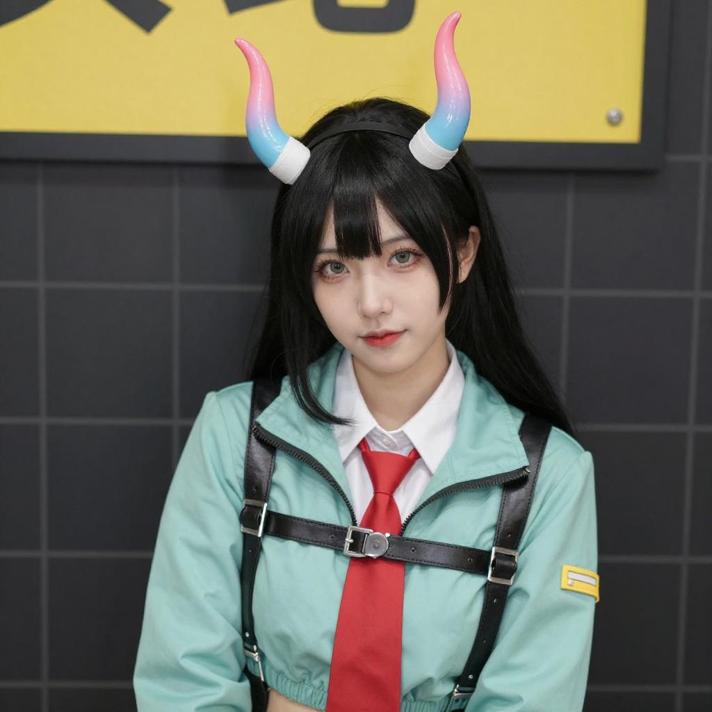 Photograph of an Asian woman with pale skin and black hair wearing a cosplay outfit with pink and blue horn headbands, a light green jacket, black harness, and red tie. She has red lipstick and is seated against a black tiled wall with a yellow sign above her.