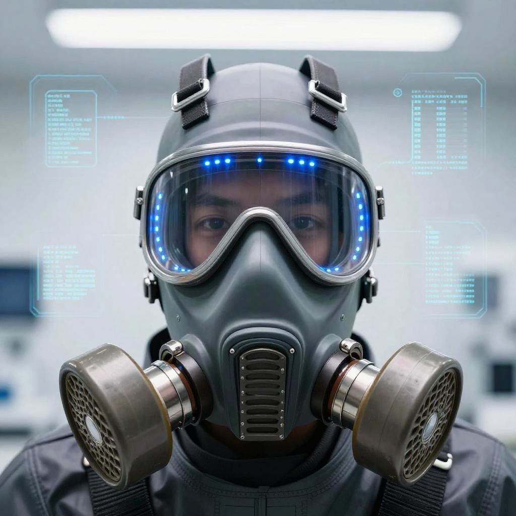A dark, moody photograph of a muscular man in a black, tactical uniform and helmet standing in the center of a dimly lit, industrial warehouse. He wears a gas mask and holds a baton. Behind him, rows of workers in similar uniforms sit at workstations cluttered with wires. The warehouse has high ceilings with bright, rectangular windows. The overall color scheme is blue and gray, creating a tense atmosphere.
