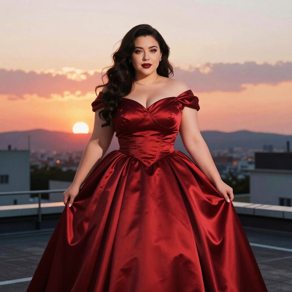 A lanky woman in a classic glamour style, wearing a rich red satin ball gown with a fitted bodice and full pleated skirt, stands gracefully at a sunset photography location on a rooftop, capturing the vibrant hues of the sky in the Kyoto Animation visual style. Sexy. Pretty face and beutiful eyes