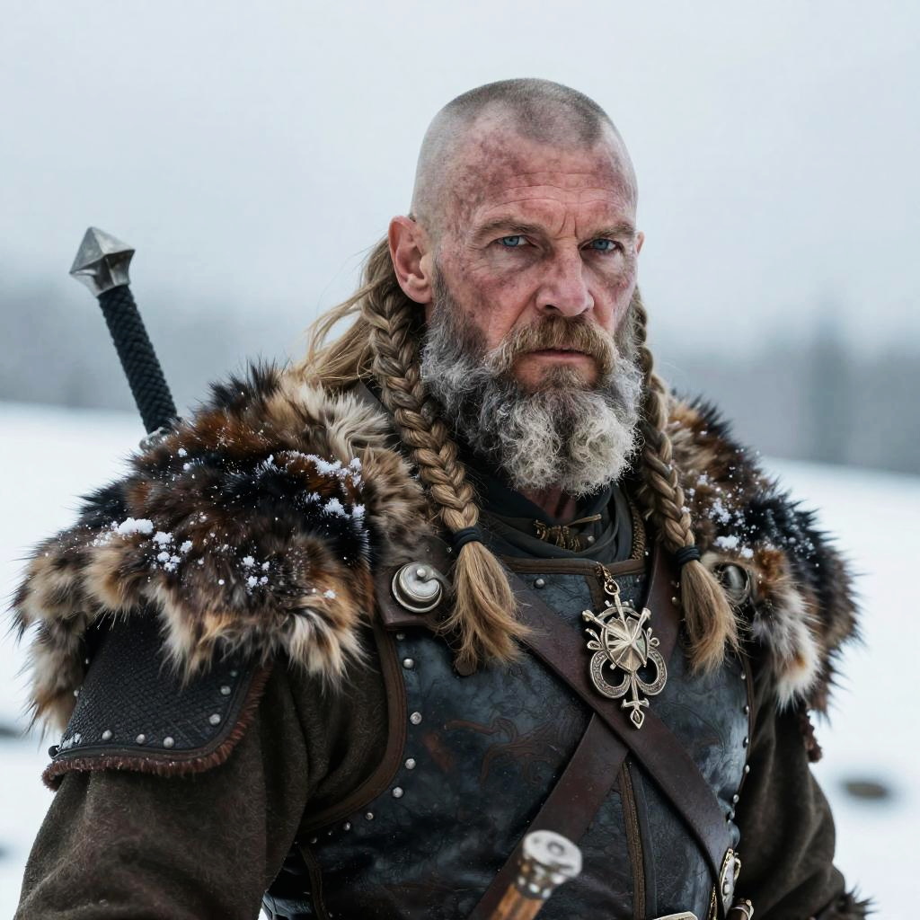 Photograph of a muscular, bearded man with a shaved head, sitting by a roaring campfire in a dark, mountainous forest at dusk. He wears dark, metallic armor with fur trim, a leather belt, and a silver necklace with a round pendant. His expression is intense, with furrowed brows and a focused gaze. The firelight illuminates his face and armor, casting shadows and highlighting the texture of the metal and fur. Snow-capped mountains and tall, dark trees are visible in the background, creating a dramatic, rugged outdoor setting.