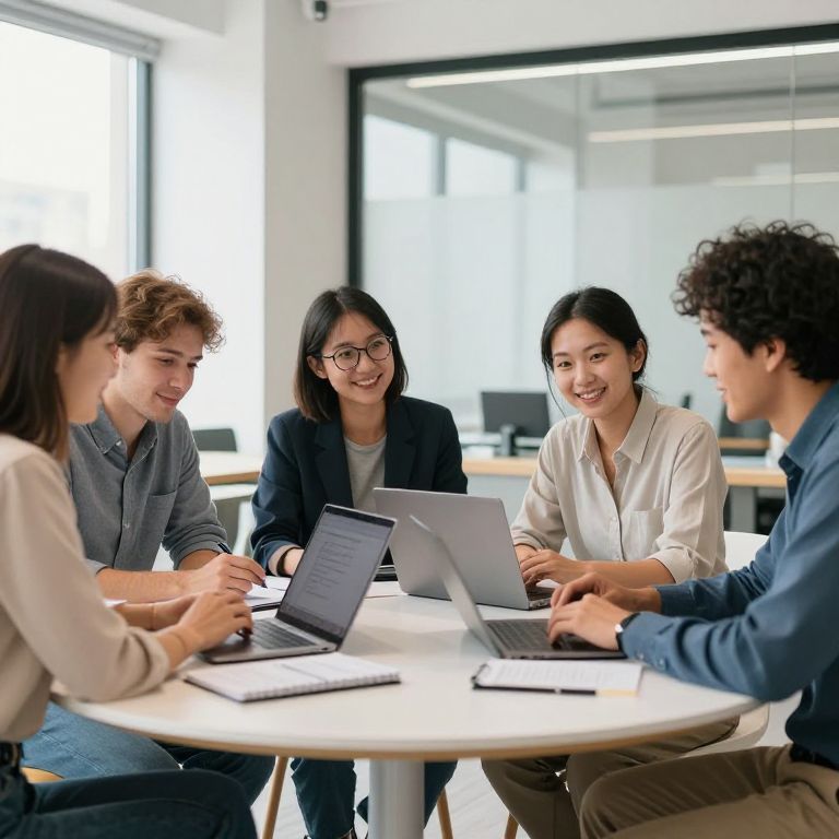 A brightly lit modern round table in a bright open-plan office space, a group of four professionals in their 30s with diverse features—slightly curved glasses, warm smiles—collaborating on a project, laptops and notebooks arranged neatly around the table