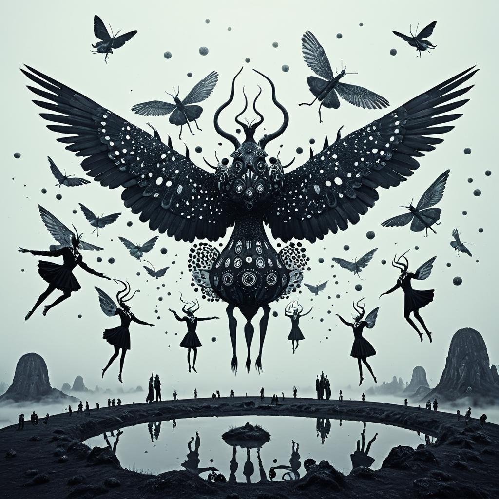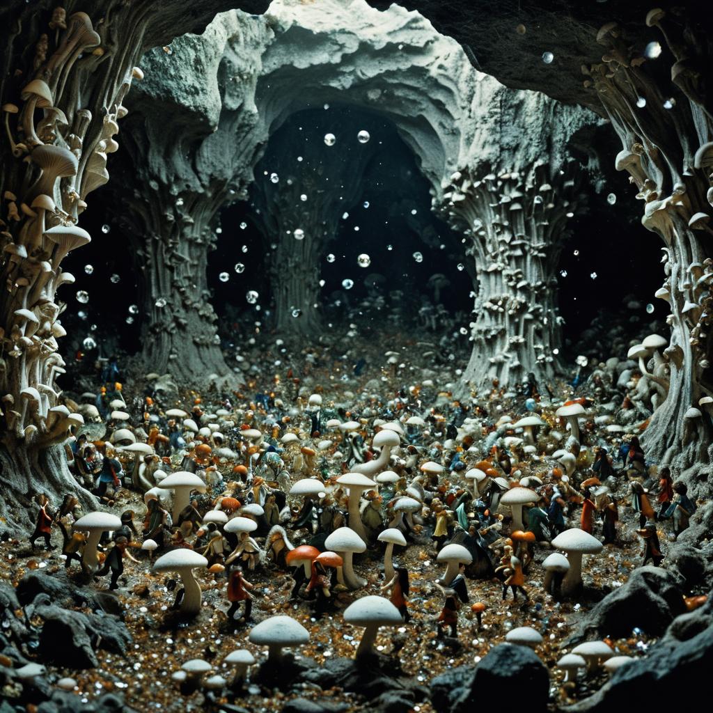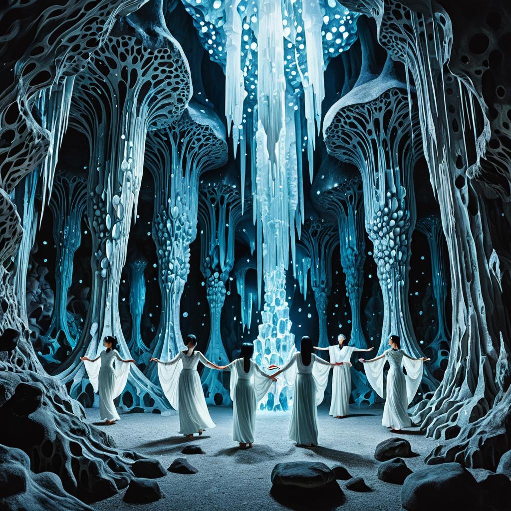 Ethereal dancers with flowing garments, crystal caves with glowing stalactites, surreal digital painting inspired by James Jean, Yayoi Kusama, hyper-detailed, organic surreal shapes, hypermaximalist, great composition.