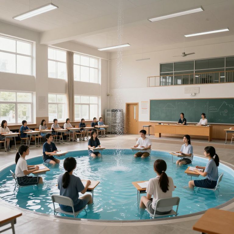 Photograph of a bright, modern classroom with a circular indoor swimming pool. Students in uniforms sit on chairs in the water, focusing on notes, while