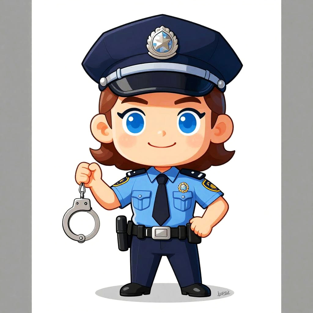 This is a colorful, cartoon-style digital drawing of a female police officer with a big head and small body. She has brown hair, blue eyes, and is smiling. She wears a blue police uniform with a cap, a black tie, and black pants. She's holding a pair of handcuffs in her right hand and has her left hand on her hip. The background is plain white with gray borders on the left and right. Artist's signature is in the bottom right corner.