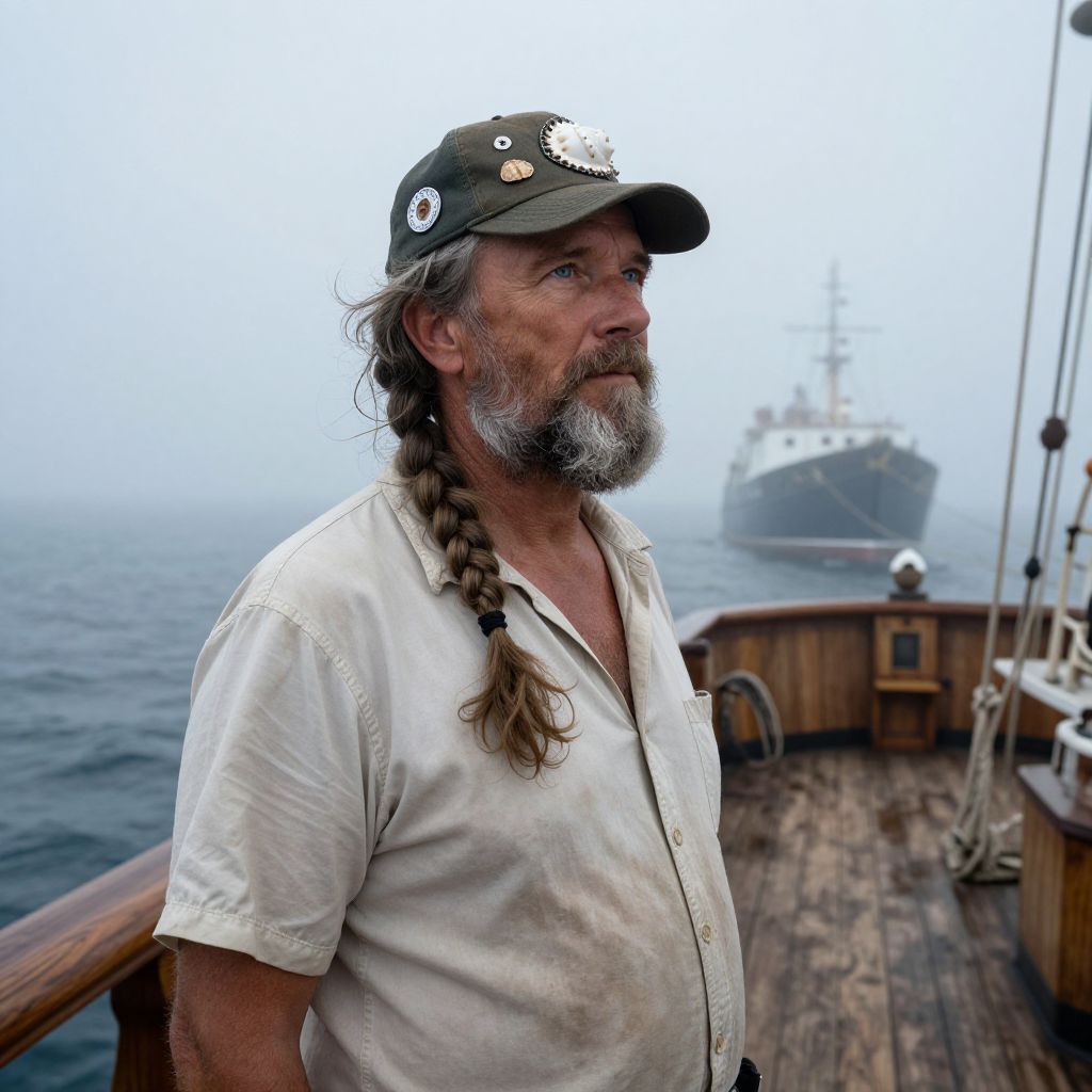 A seasoned coastguard veteran with rugged features and a sun-kissed complexion stands on an old wooden ship's deck. His piercing blue eyes gaze wistfully out to sea in a double exposure portrait, his braided salt-and-pepper beard and seashell-adorned hat reflecting countless voyages. As dense fog rolls in from the horizon, enveloping man and vessel alike, its ethereal embrace captures the transient nature of life at sea. This captivating image showcases the powerful interplay between human resilience and the vast unpredictability of nature, evoking a sense of longing for both adventure and home.