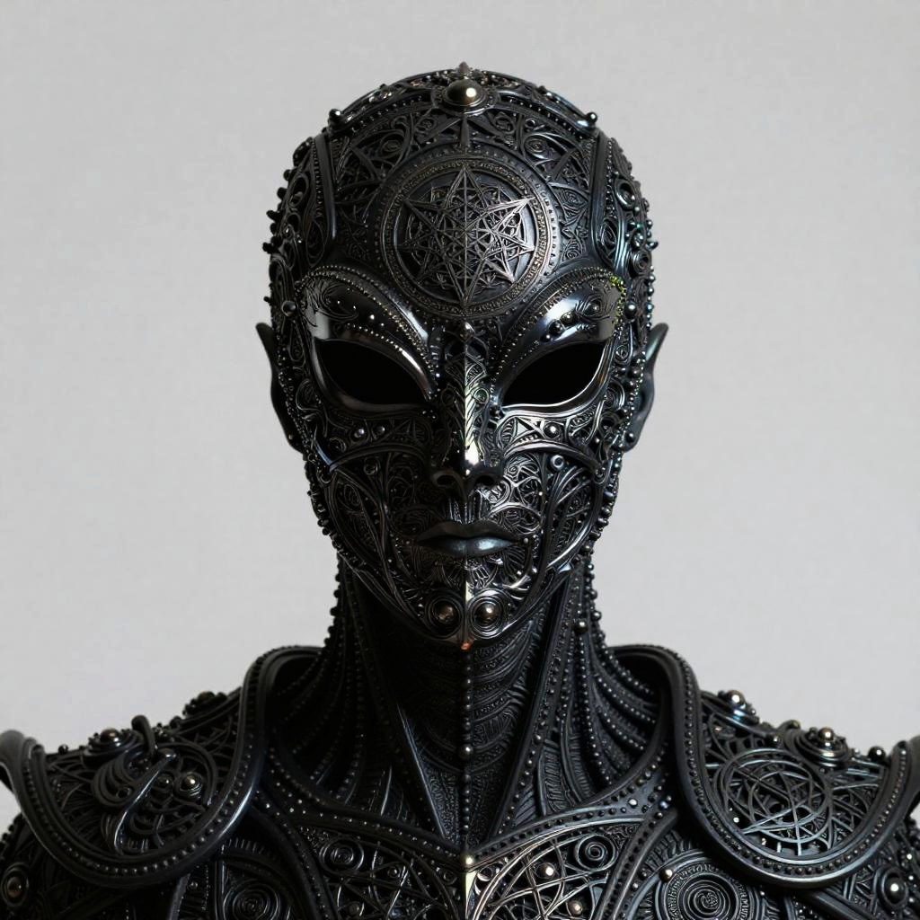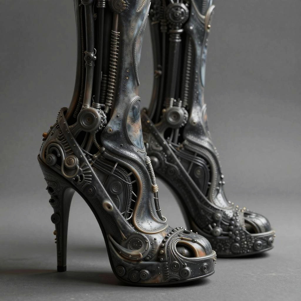 A color photograph of high heel shoes, designed in the style of H.R. Giger. The image is rendered as biomechanical fusion, with a focus on organic textures and dark shading. The photograph emphasizes the sculptural, avant-garde quality of the shoes, creating a visually captivating and unique composition.